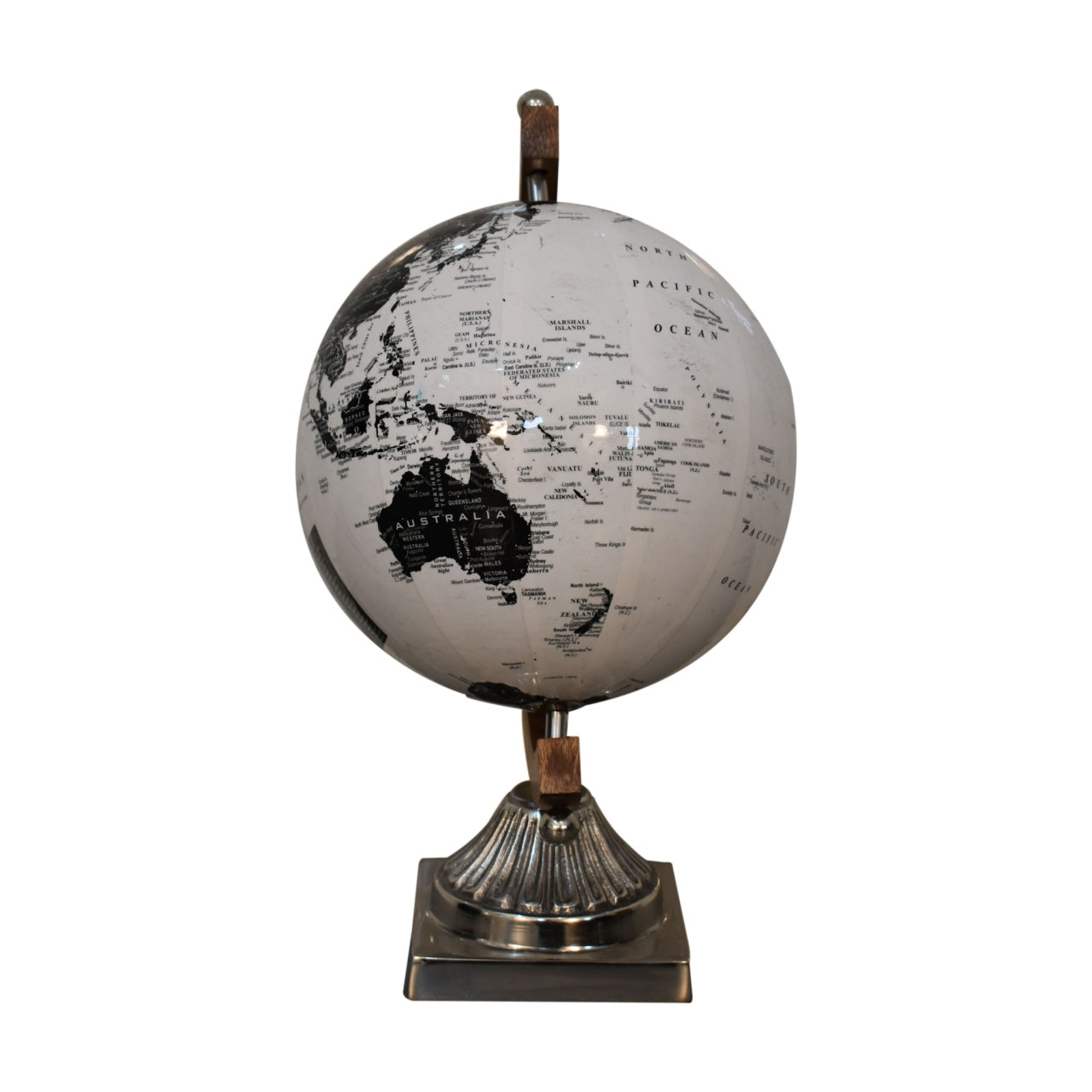 The wooden framed globe boasts a lovely white and black glossy finish. The spherical globe features loose engravings, depicting the world map. The relaxed nature and style of the design creates a striking contrast with the chrome frame. This product is handcrafted individually and as every piece is unique please do expect variations in finish, texture, size and should not be considered as a defect.