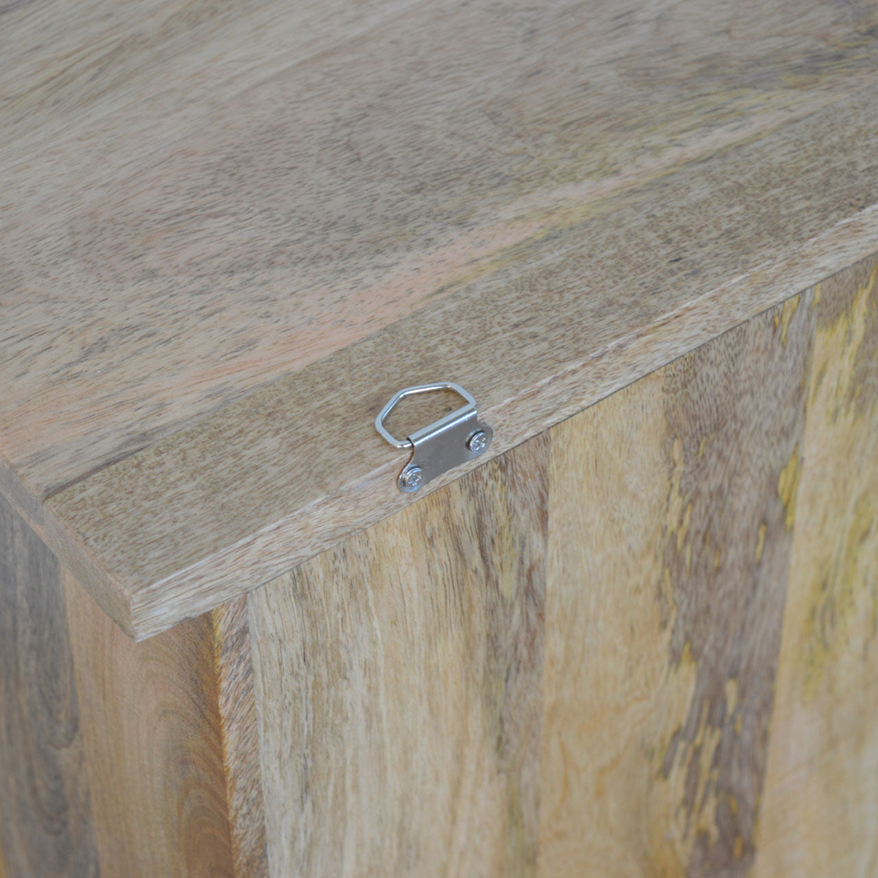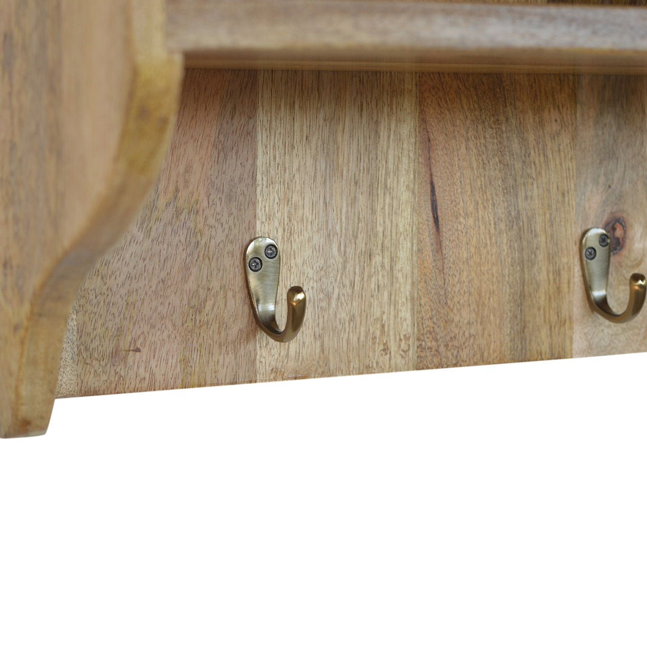 A simple but handy coat rack and shelf in solid mango wood with an oak-ish finish. It offers five hand-forged antiqued brass hooks offering three shelves for storing any keys hats, gloves or small pieces. This coat rack takes up no floor space and can be hung above a console or bench using subtle eye hooks.