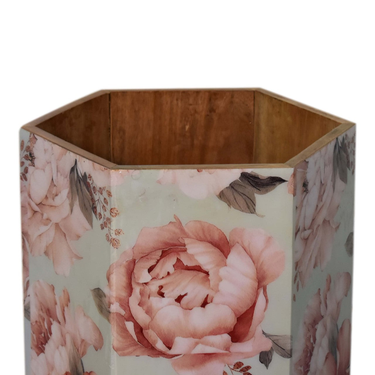 This elegant hexagonal umbrella stand is decorated with a stylish pink floral print across all sides, made to enhance the hallway area of the home.