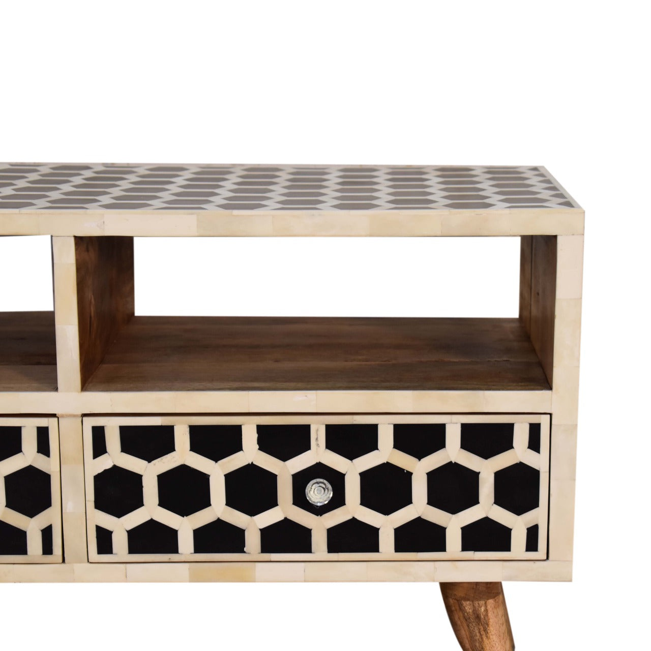 This media unit has a clean and simple design to suit most homes. This piece has a lovely oak-style finish and features 2 bone inlay drawer fronts which have a honeycomb pattern and 2 glass knobs. It provides 2 open slots and 2 drawers for extra storage. Some other features 4 Scandinavian style legs.