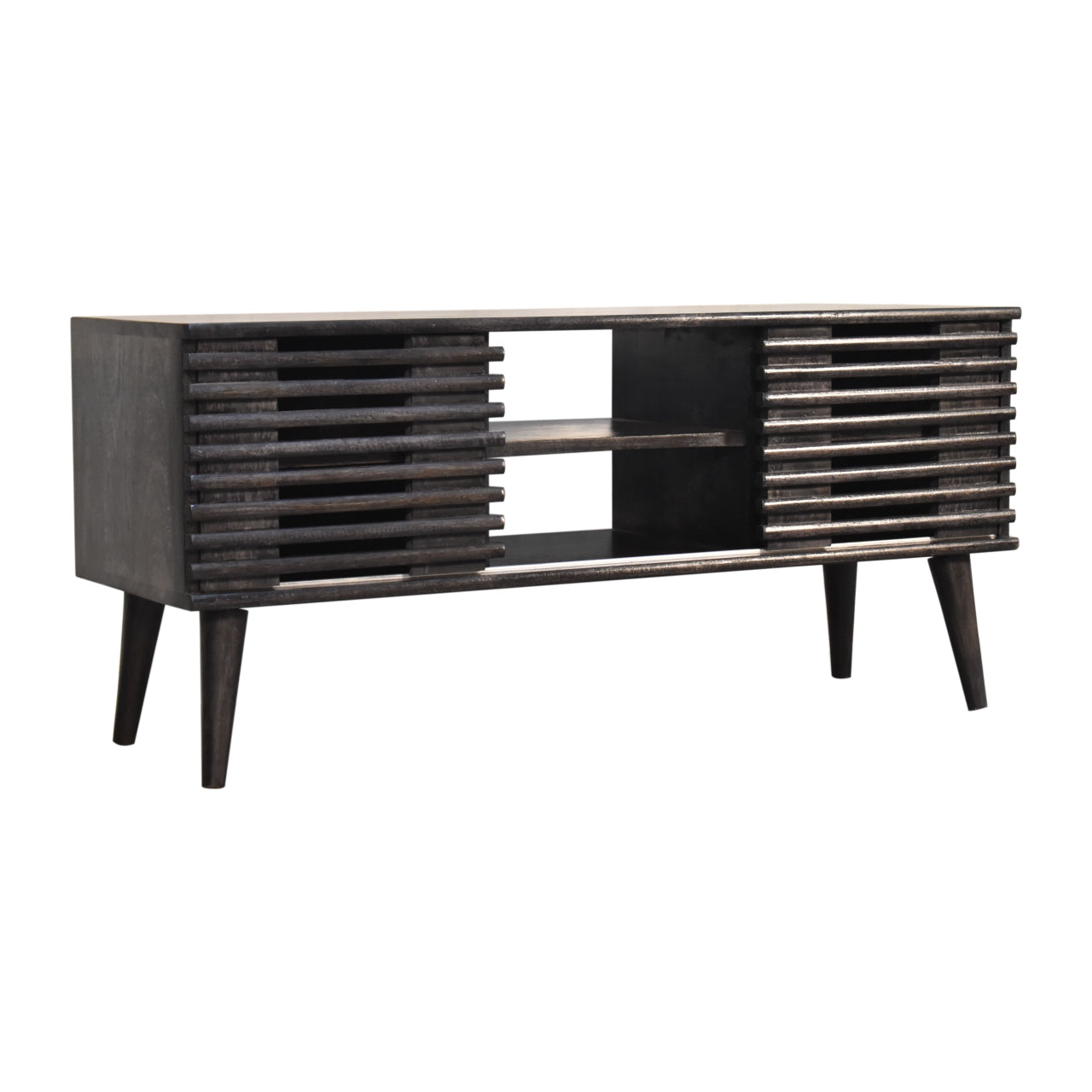 Perfect for storing and displaying the TV, speakers, or games consoles, our Kobe Media Unit is an ultra-practical piece with a trendy Mid-Century Modern meets Scandi look. Constructed from 100% solid mango wood in an ash black finish, this elegant piece of furniture showcases a ridged design on the cabinet doors giving the piece dimension and texture. Use it in the living room or an open-plan kitchen-living-dining space with a different zone for relaxing and entertaining.