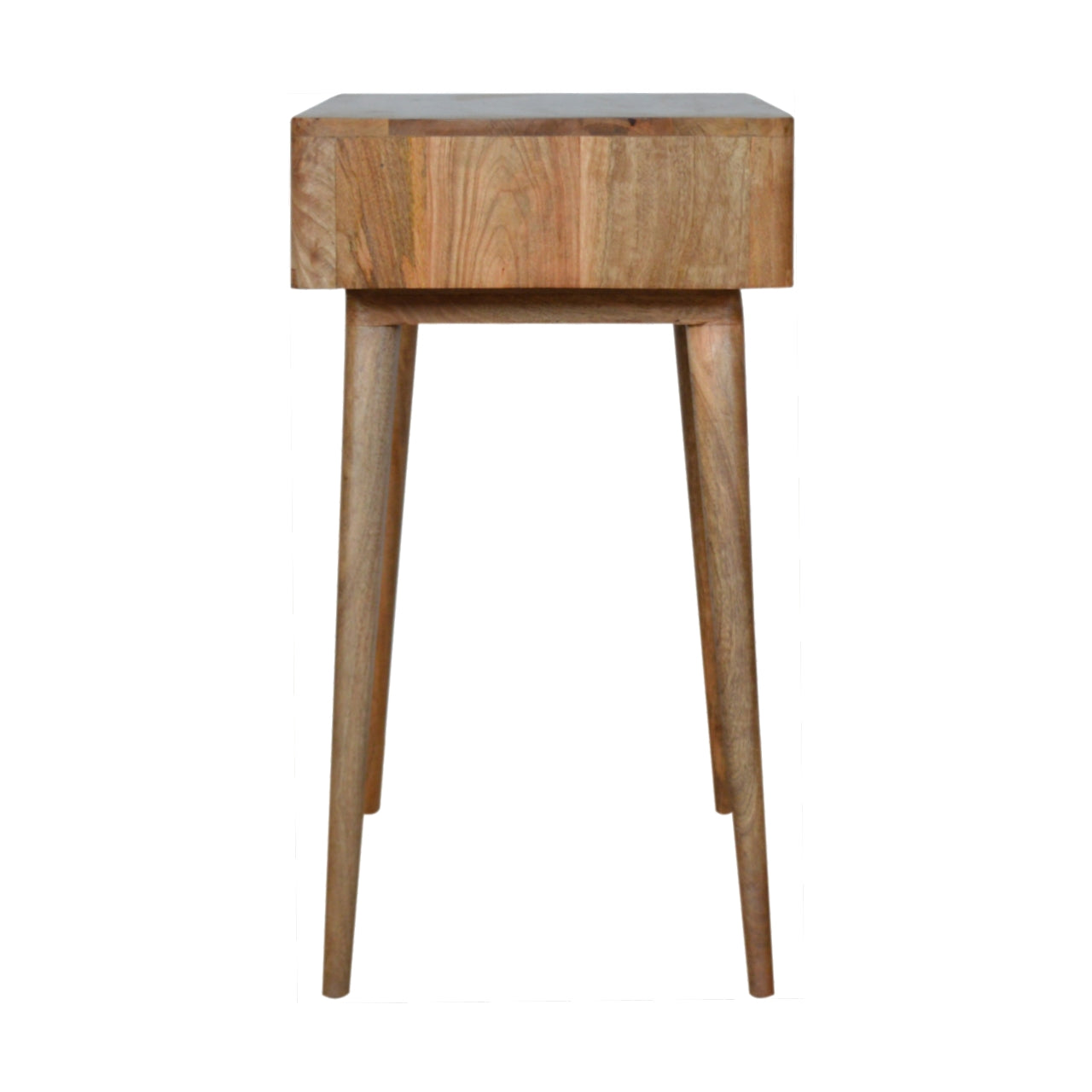 This writing desk has been constructed from 100% solid mango wood and finished in a fine oak-style finish body. The main feature of this piece is the resin leaf embossing detail on top of the piece giving it extra dimension and character and allowing you to store any bits and pieces discreetly. It also has 4 Nordic style legs and ample space on top for a lamp, photo frames or ornaments.
