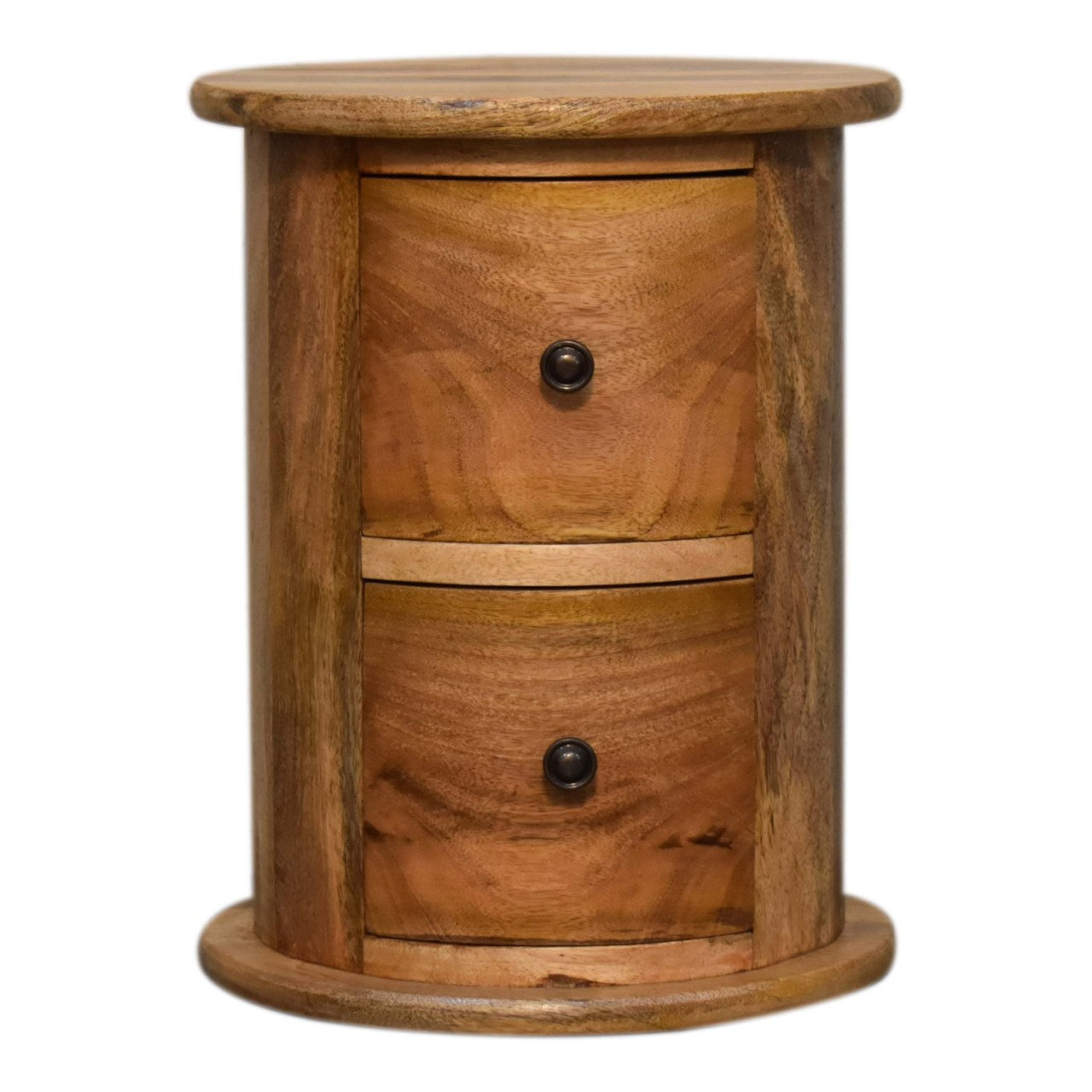 This cute mini round 2-drawer country-style drum chest is made from 100% solid mango wood and has a fine oak-style finish with shiny knobs on the drawers. The piece is perfect for storing small items like keys, and loose change and has space on top for displaying photos, ornaments, and collectibles. This product can be used as either a bedside table, an end table, or an occasional table. This petite product is a part of Recession Collection.