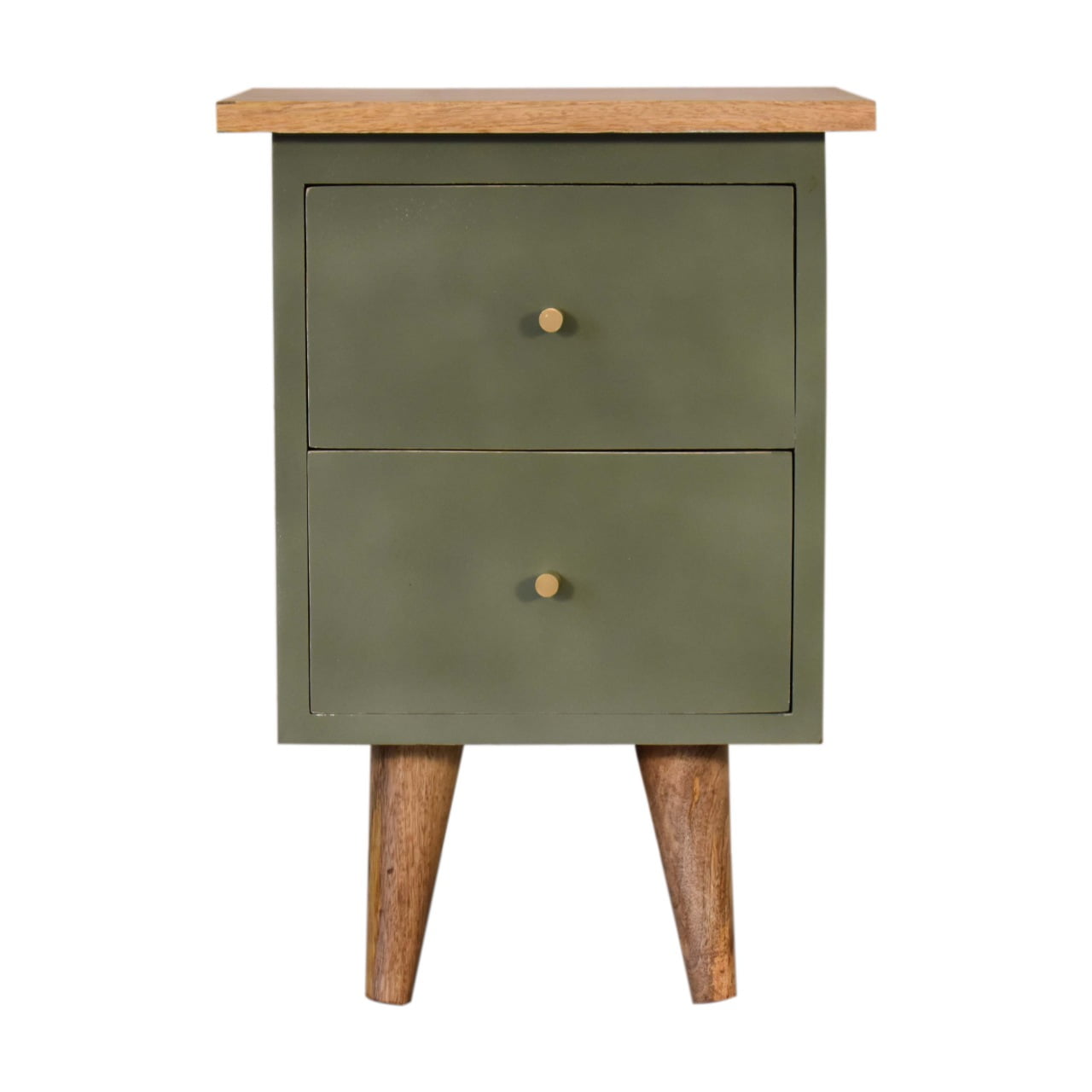 This bedside table has been constructed from 100% solid mango wood and finished with an oak-style finish top and Nordic style legs. The body of the bedside has been finished in a hand painted olive green paint and features 2 shiny knobs on the 2 drawers for easy access.