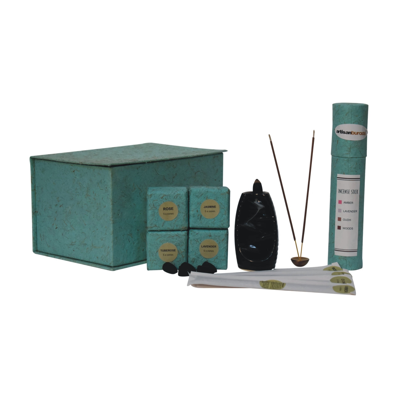 The backflow fountain burner set is exquisitely crafted and features a unique oval design, ideal as a gift for friends and family. The set includes a backflow burner, incense holder, and fragrant backflow cones and incense sticks. The incense burner can clean a calm and peaceful environment with the smoke being created in the air to maintain a pleasant body and mind, and improve the efficiency of work and quality of life.