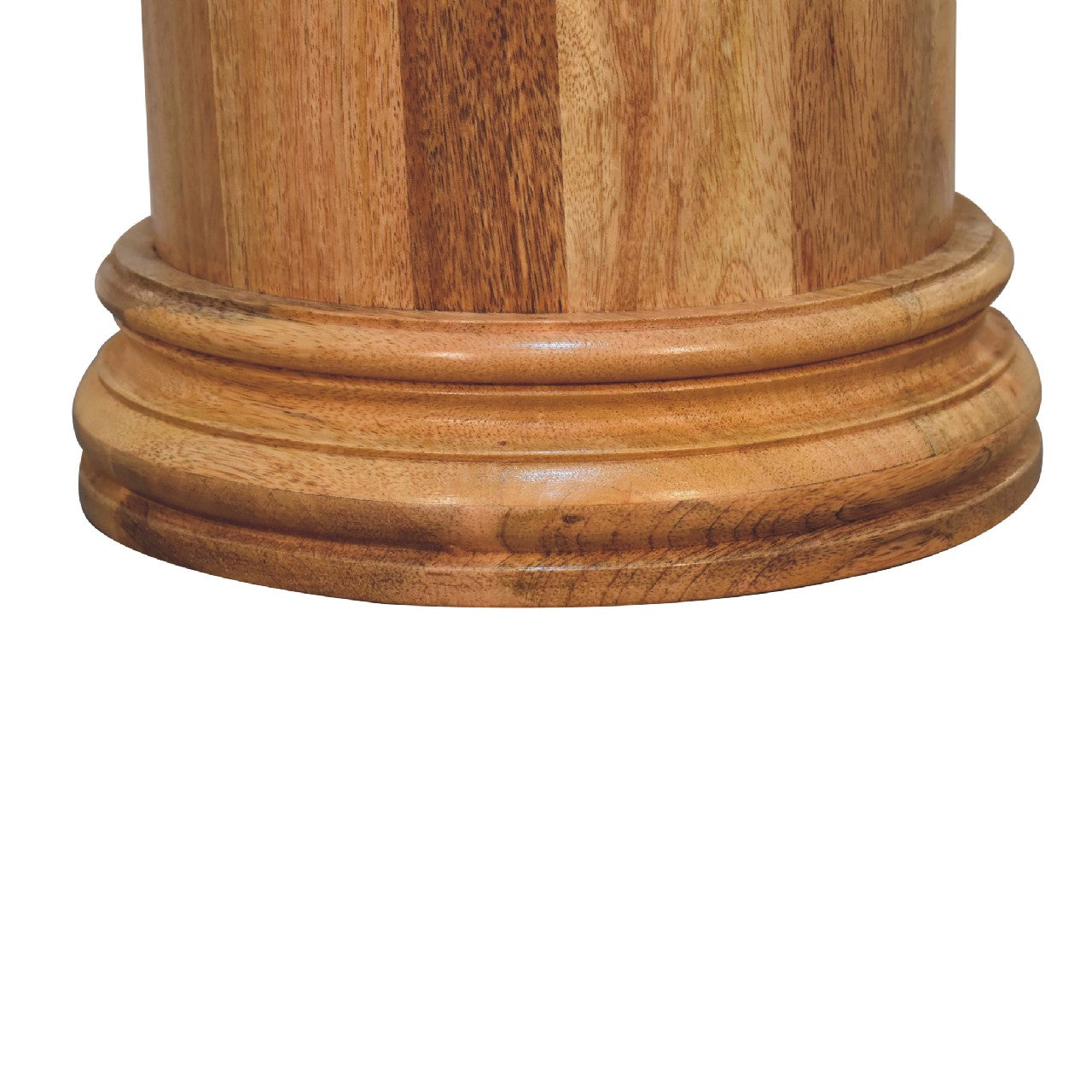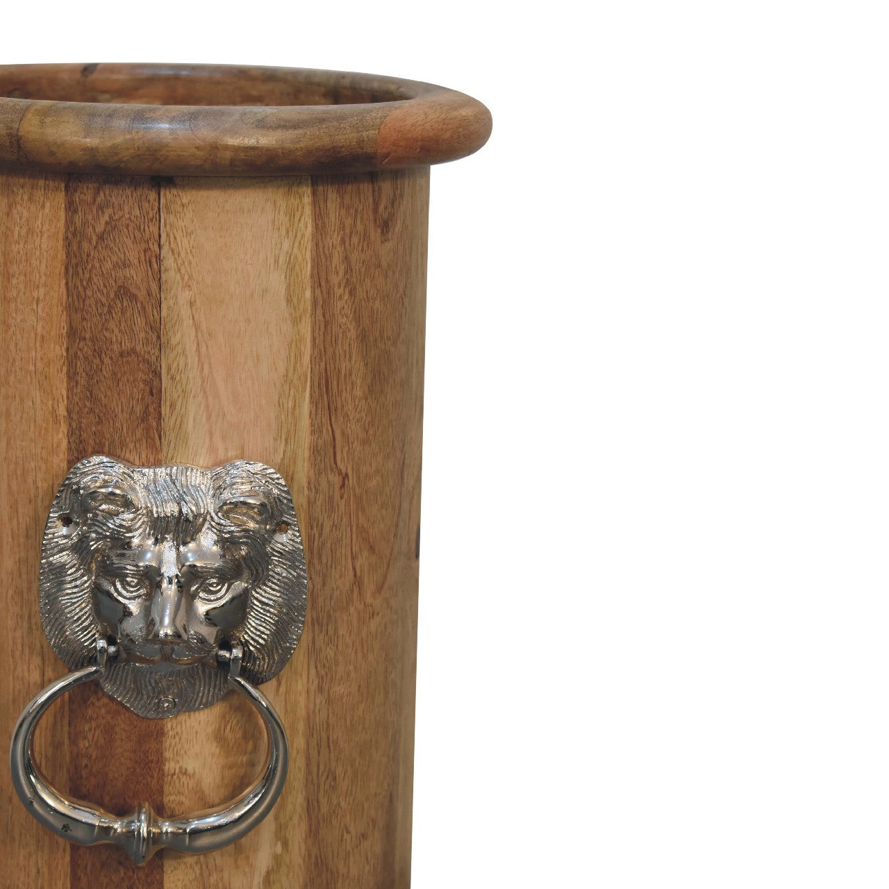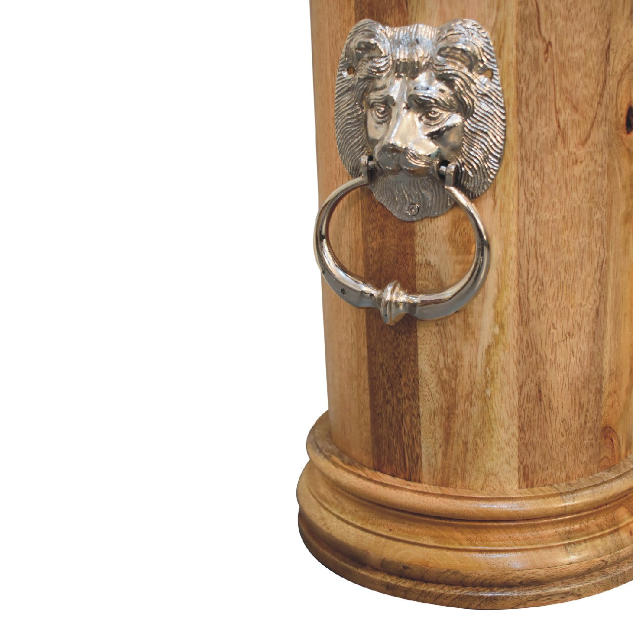 This round umbrella stand has been constructed from 100% solid mango wood in an oak-style finish and features a classy lion round knocker for a luxurious vibe and is made for hallway convenience. This is a very useful and multi-functional piece that would also make a perfect gift for friends or family.