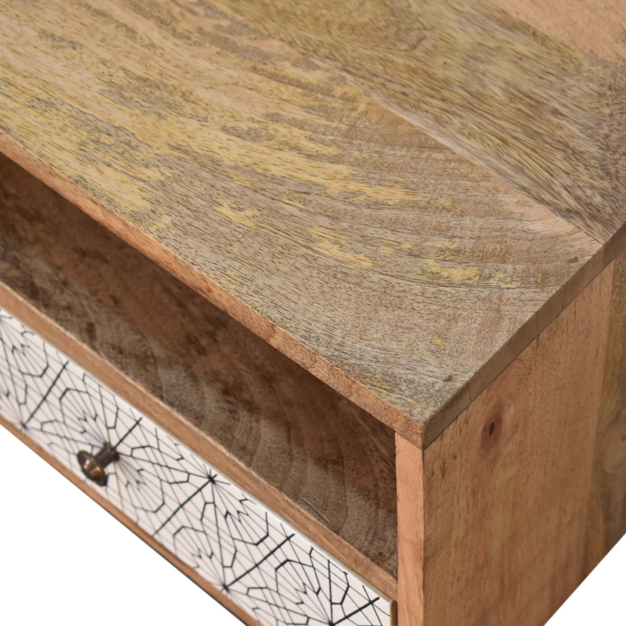 This 2 drawer media unit has been constructed from 100% solid mango wood and finished in a fine oak-ish finish body. The main feature of this piece are the screen printed drawer fronts and which each have a beautiful black and white geometric design giving the piece extra dimension and character. Useful storage is provided with the open slots and drawers that can be used to store any CD's, films or books.