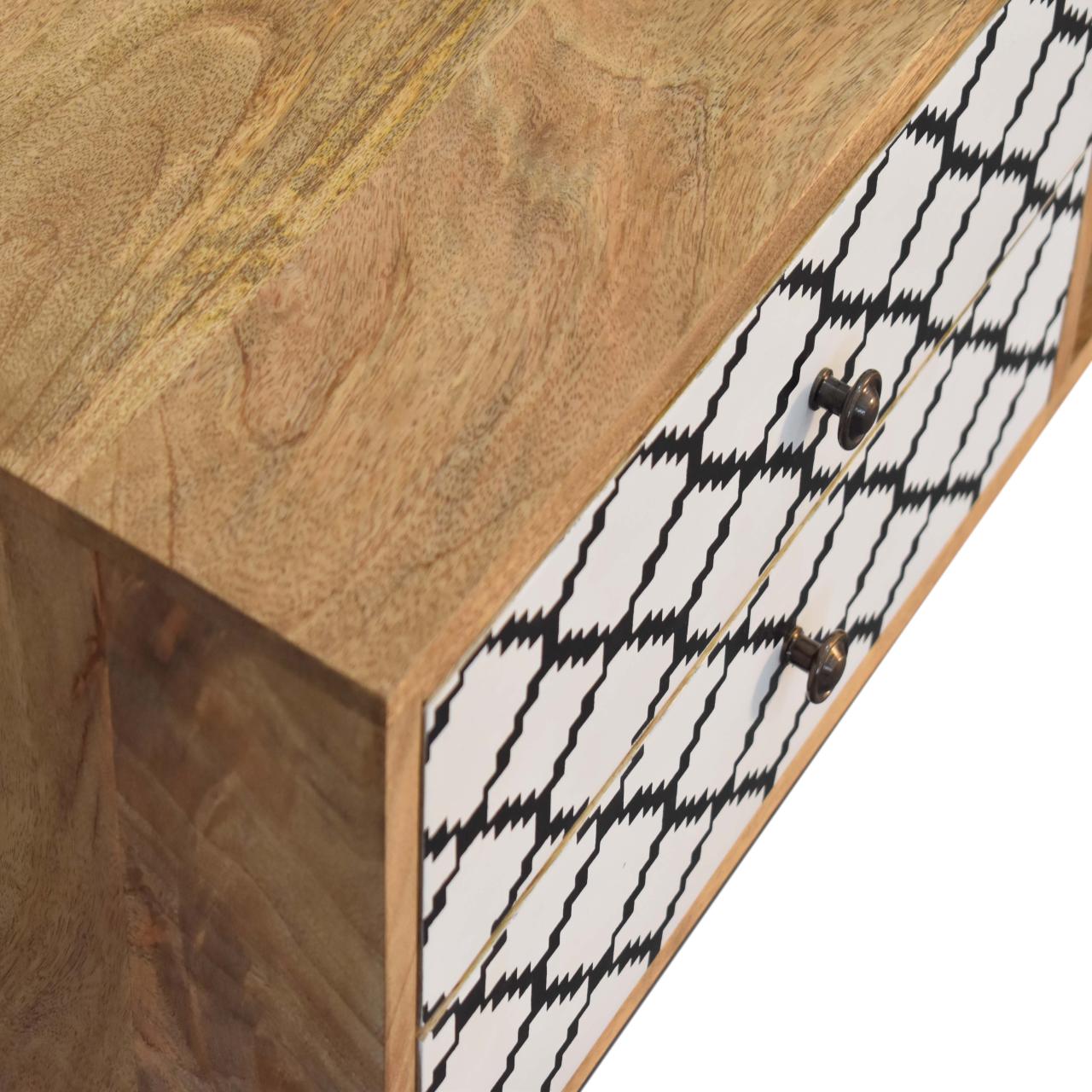 This tow drawer media unit has been constructed from 100% solid mango wood and finished in a fine oak-style finish body. The main feature of this piece is the patterned screen printed drawer fronts which have a beautiful black and white design giving the piece extra dimension and character. It also has 4 Nordic-style legs and ample space on top for a TV.