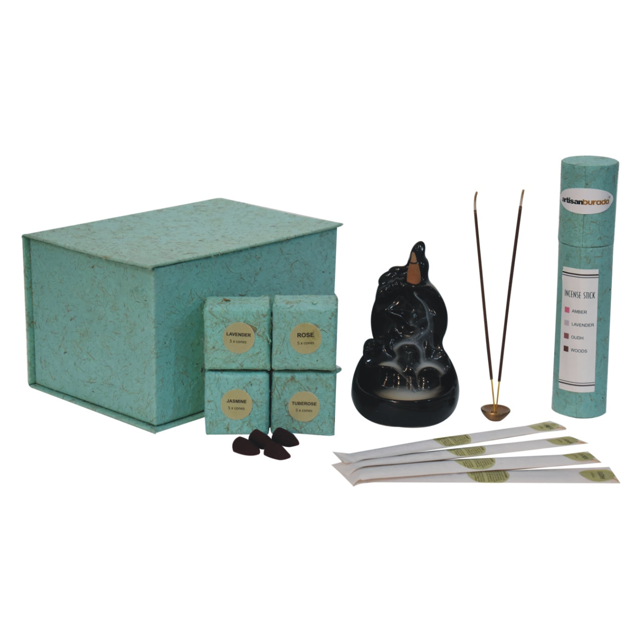 The backflow fountain burner set is exquisitely crafted and features a unique temple style design, ideal as a gift for friends and family. The set includes a backflow burner, incense holder, fragrant backflow cones in Rose, Lavender, Jasmine, Tuberose and fragrant inscense sticks in Amber, Lavender, Oudh and Woods. The incense burner can clean a calm and peaceful environment with the smoke being created in the air to maintain a pleasant body and mind, and improve the efficiency of work and quality of life .