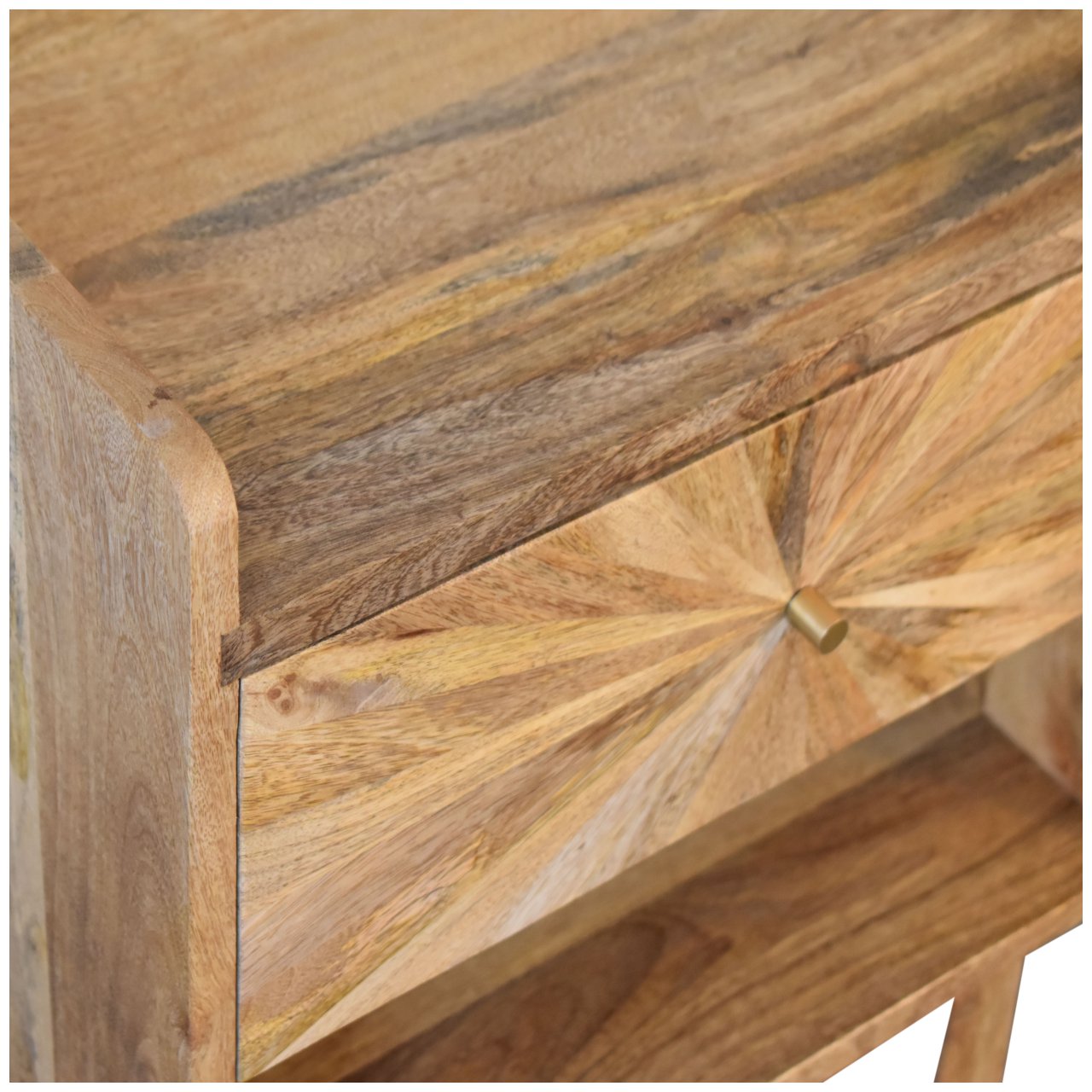 This bedside is perfect when it comes to keeping your bedroom organised and keeping little bits close to you before bedtime. The sunrise design brings a more elegant and eye-catching display while proving handy all over your home. It is made with 100% solid mango wood with a fine oak-ish finish.