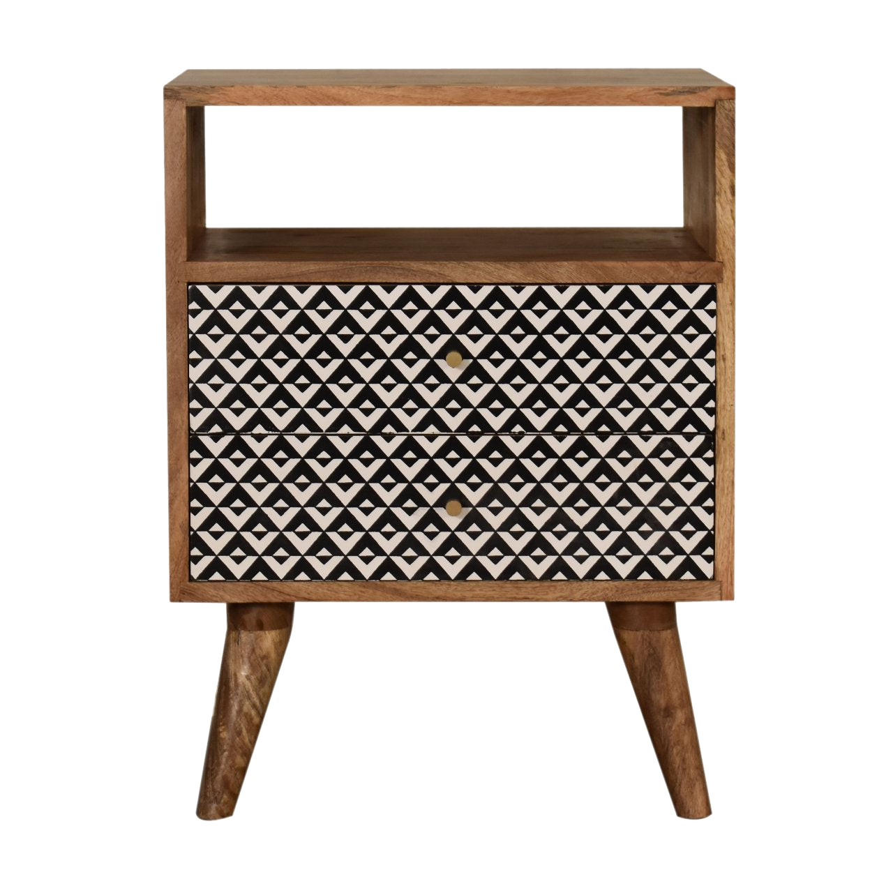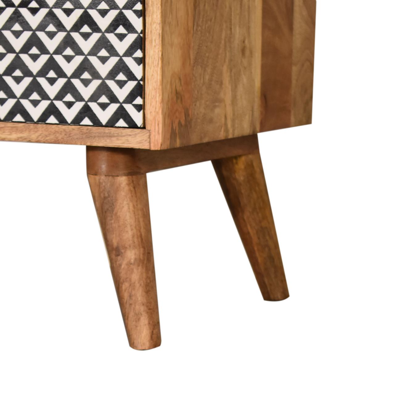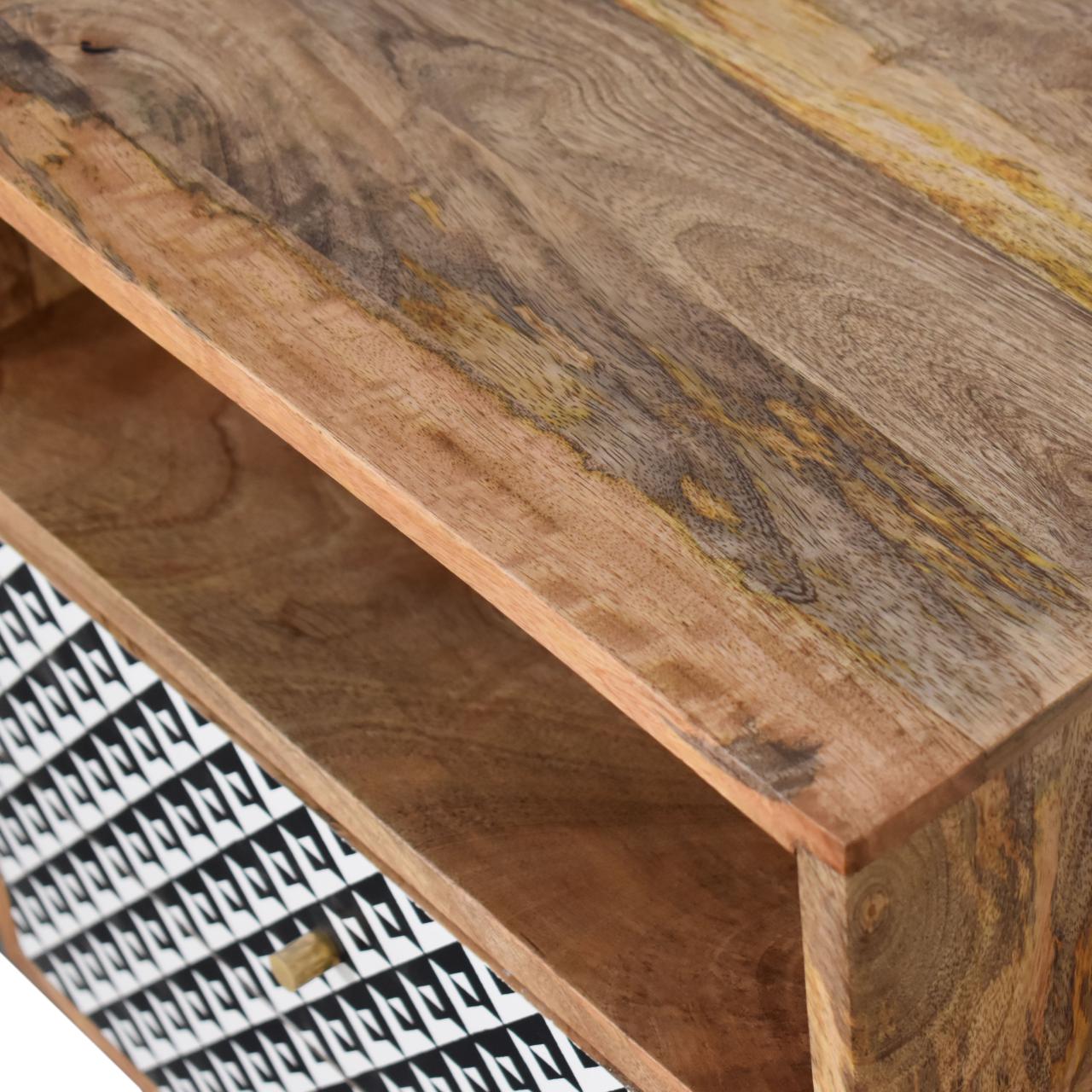 This bedside has been constructed from 100% solid mango wood and finished in a fine oak-ish finish body. The 2 drawers feature a black and white pattern which is bound to uplift your bedroom and allow you to store any bits and pieces discreetly.