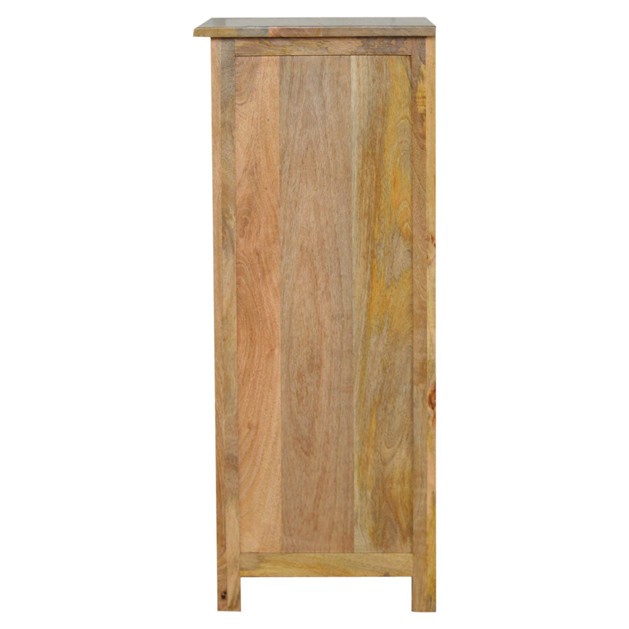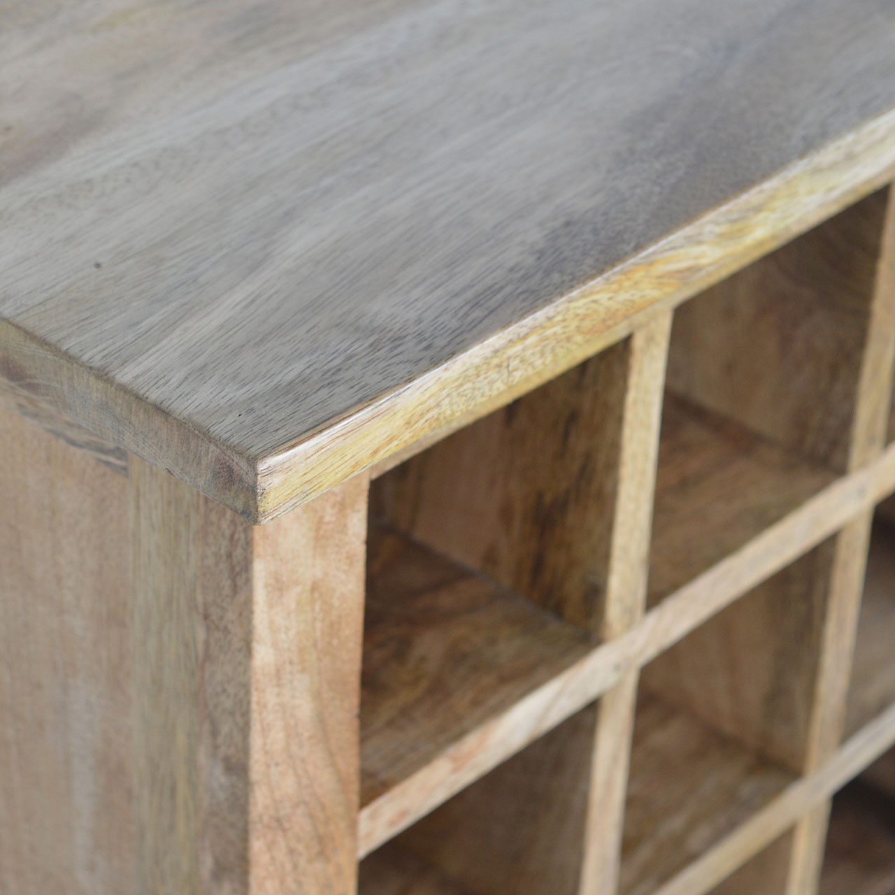 This is a beautifully handcrafted cabinet that offers 3 drawers and 9 wine bottle slots, it is constructed from 100% solid mango wood with an oak-style finish. The slots are ideal for storing any wine bottles and groceries or bits and bobs for the kitchen on the lower three shelves. It is practical storage that is built to last and is the perfect addition to any kitchen or dining room. Every piece of furniture is individually handcrafted and includes swing care tickets explaining the cautions and aftercare instructions. Height: 100 cm, Width: 45 cm, Depth: 40 cm Carton Height: 110 cm, Carton Width: 53 cm, Carton Depth: 47 cm