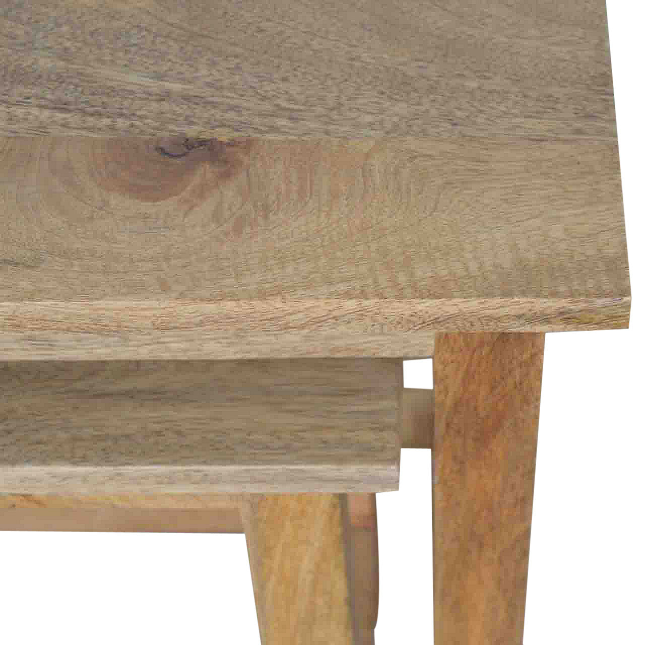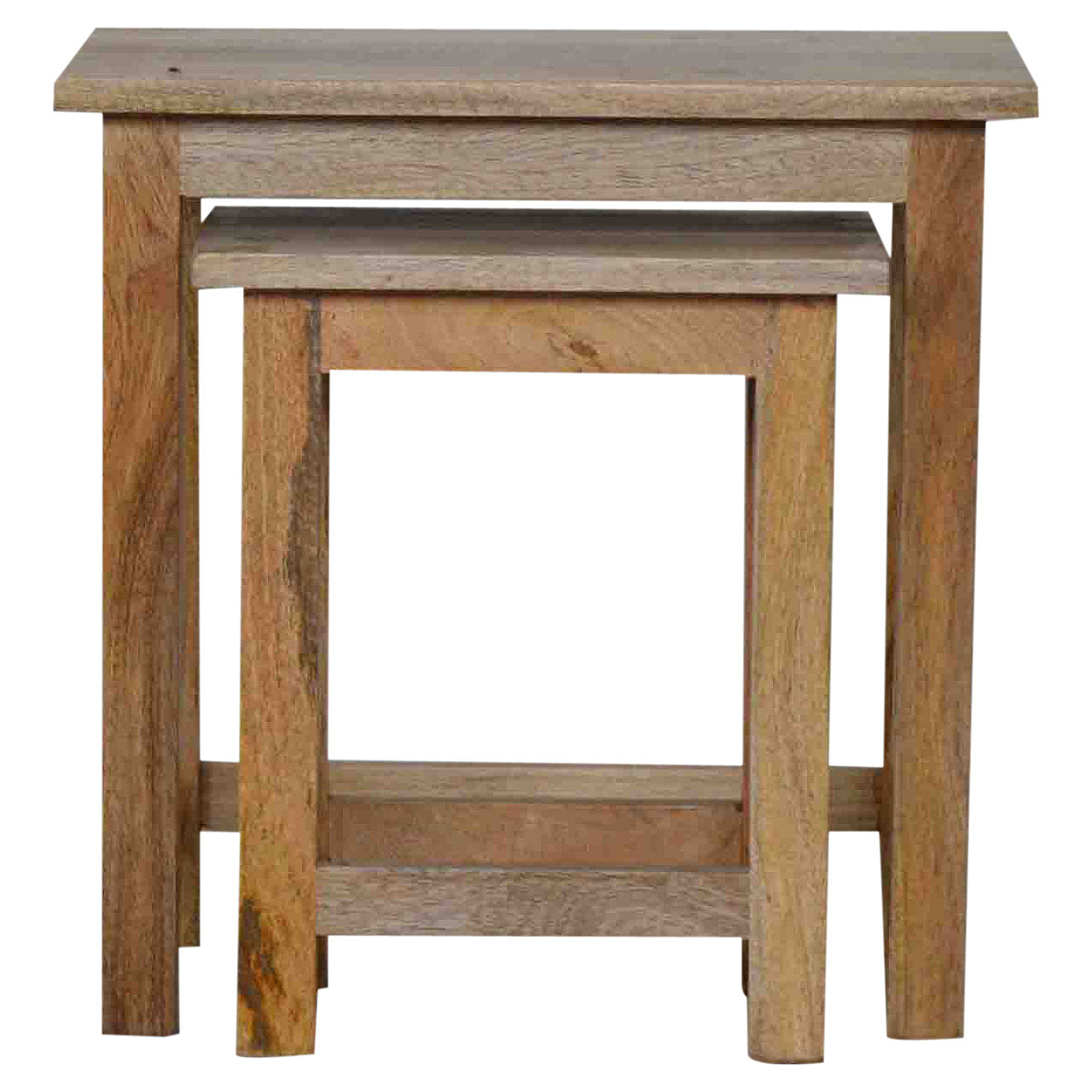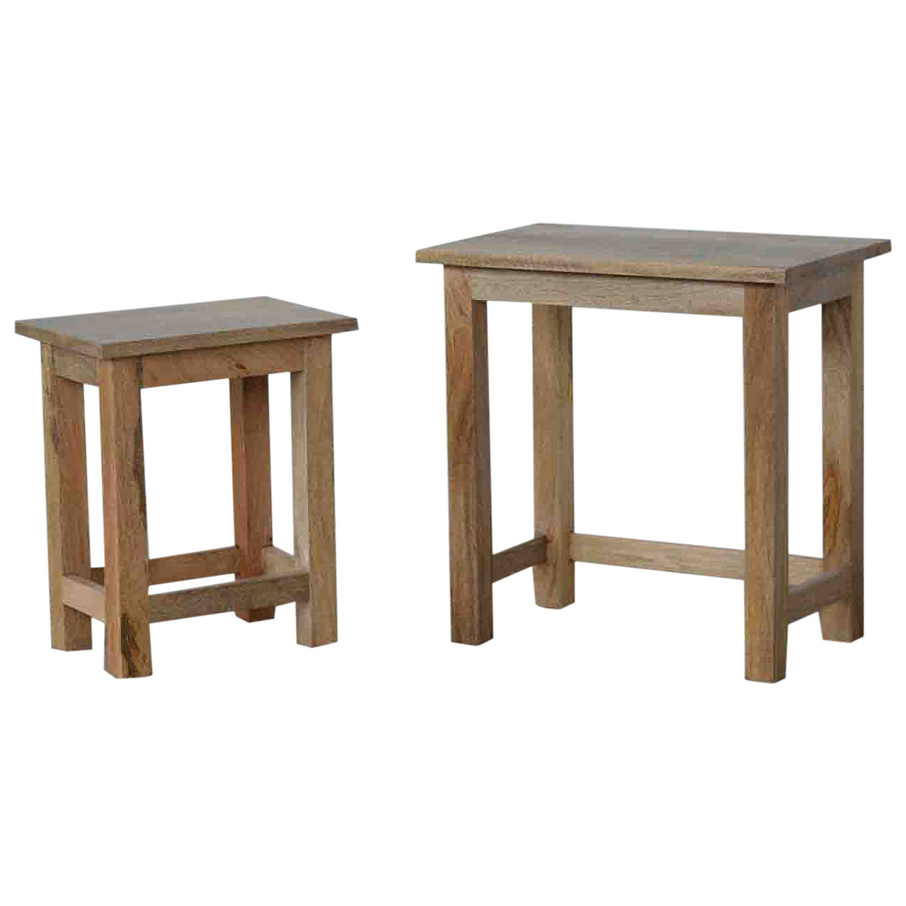 This set of two Nesting stools have been constructed 100% mango wood in an oak-ish finish and are perfect for providing extra seating for guests or for everyday use. These strong stools are functional and easy to tuck away when not in use. The stools also work as side tables providing excellent versatility. Each stool is individually hand distressed for a unique look meaning no two pieces are identical. Every piece of furniture is individually handcrafted and includes swing care tickets explaining the cautions and aftercare instructions.