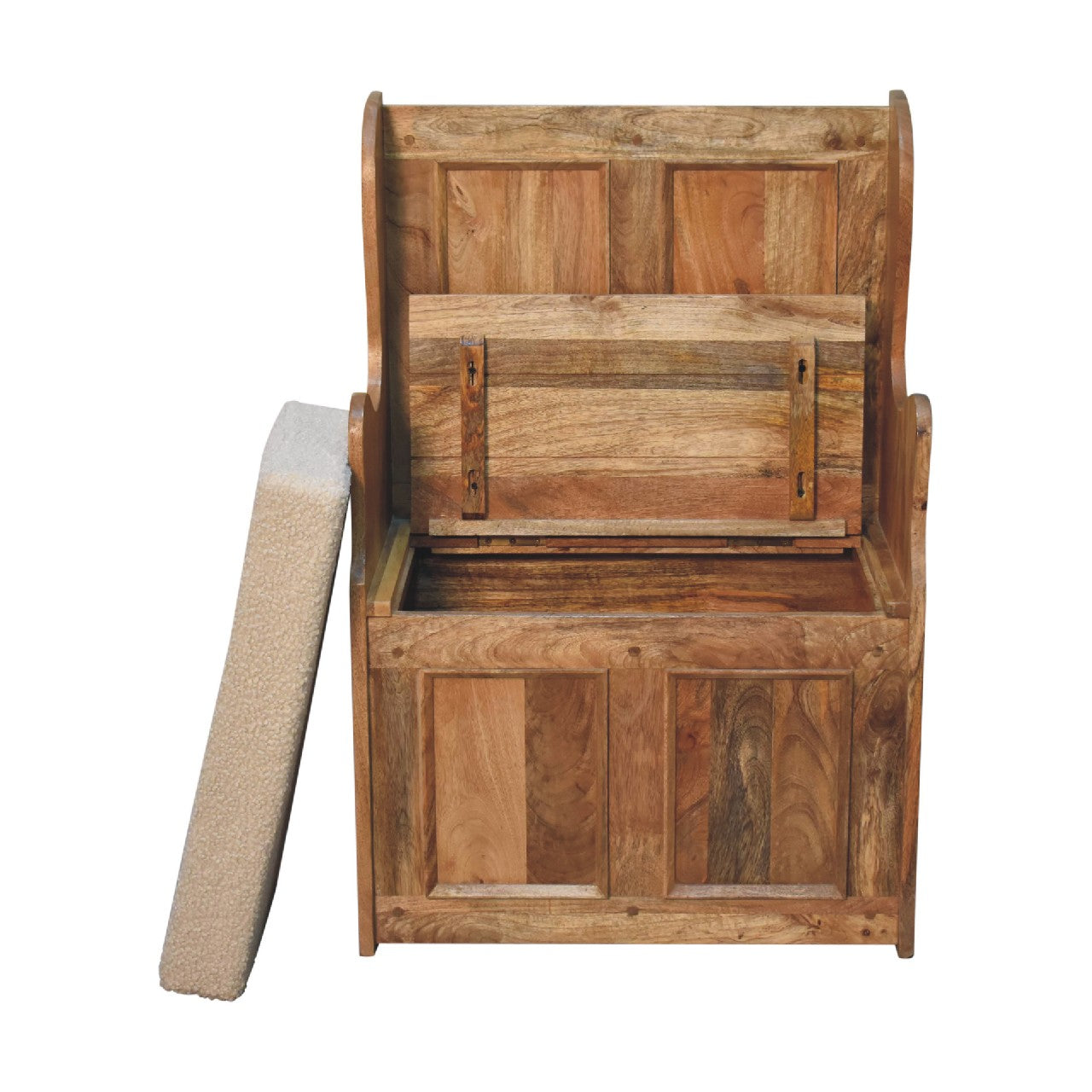 Our Small Monks Storage Bench is a practical and stylish solution for smaller hallways. Handmade from solid mango wood in an oak-style finish, it features exquisite carved sides and intricate panel detailing. With ample storage space inside, this country-style bench provides convenience without taking up too much space. The cream boucle seat adds a touch of elegance to complete the look.