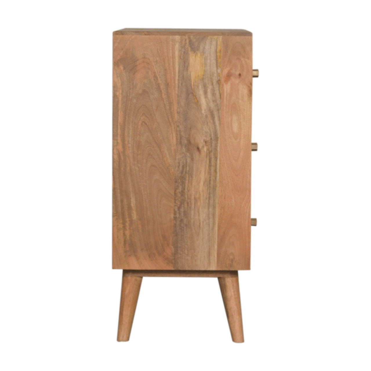 This chest has been inspired by a clean and modern design. It has been constructed from 100% solid mango wood in an oak-style finish and features 1 oak-ish and 2 gold brass cement dice-patterned drawers that blend beautifully with the grain pattern of the wood. Other features include nordic-style legs and shiny knobs.