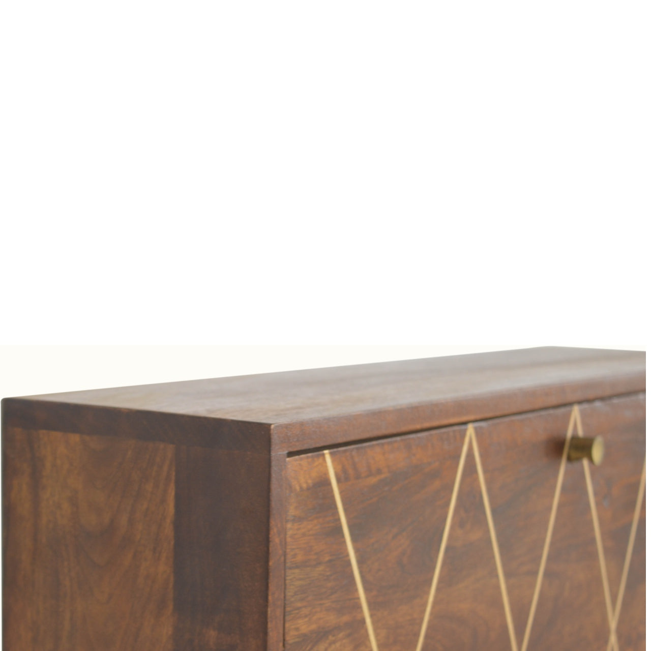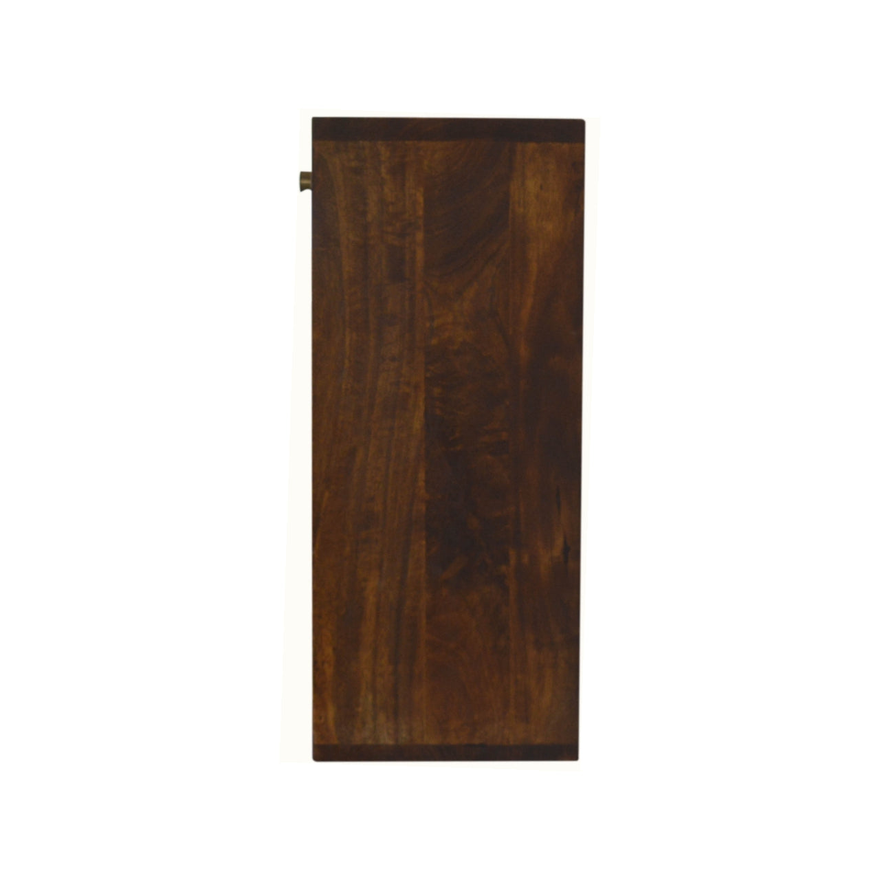 Inspired by vintage design, this solid wood flip-down writing desk provides ample space for you to work on. It is a wall-mounted piece, perfect for storage-saving solutions. It is constructed from 100% solid mango wood and has a fine chestnut finish. Other features include 1 large shelf and 2 smaller shelves perfect for working and studying. The gold wiring detail brings the whole piece together.