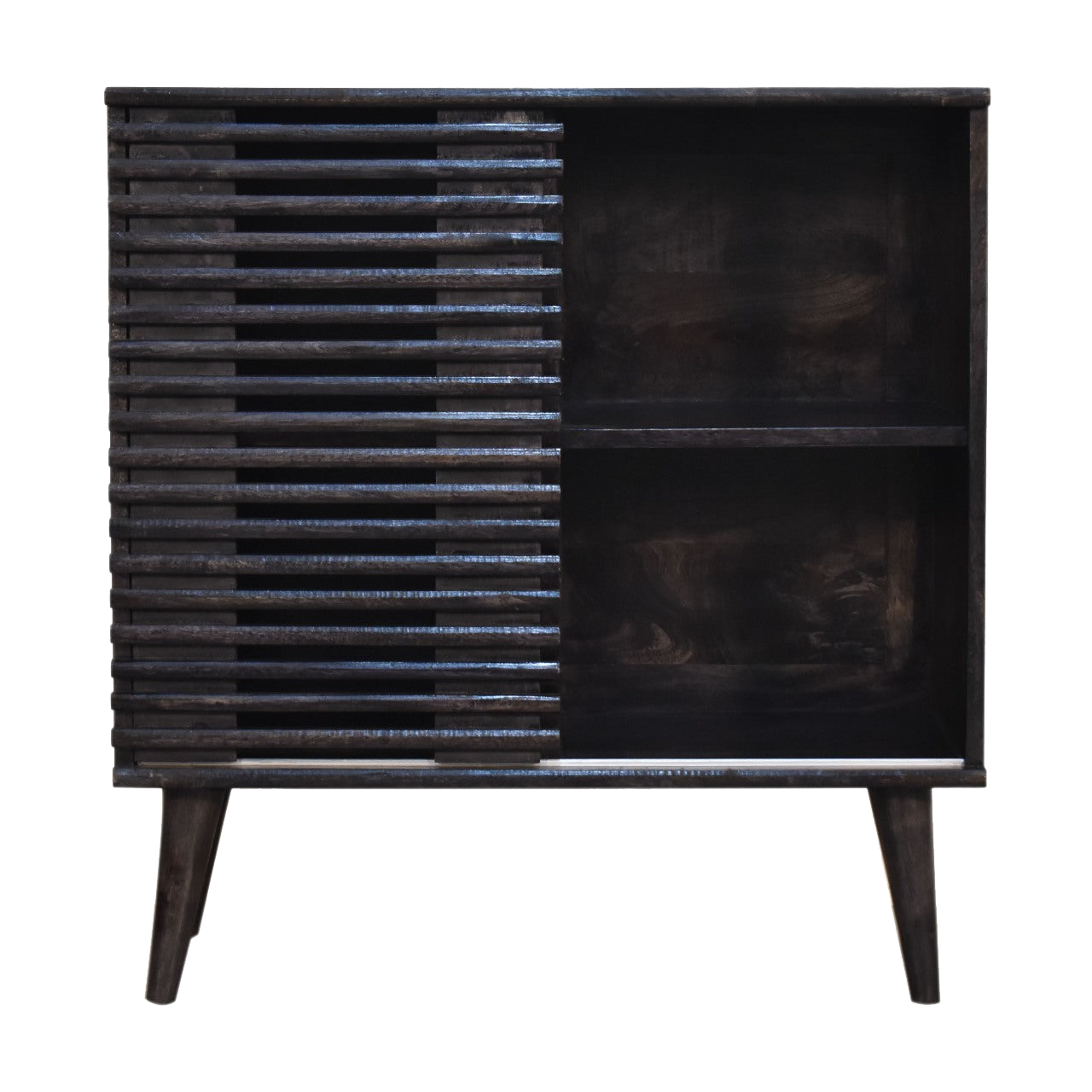 Perfect for storing and displaying books, photo albums or vases our Kobe Cabinet is a ultra-practical piece with a trendy Mid-Century Modern meets Scandi look. Constructed from 100% solid mango wood in a ash black finish, this elegant piece of furniture showcases a ridged design on the cabinet door giving the piece dimension and texture. Use it in the living room or the hallway as a multifunctional piece.