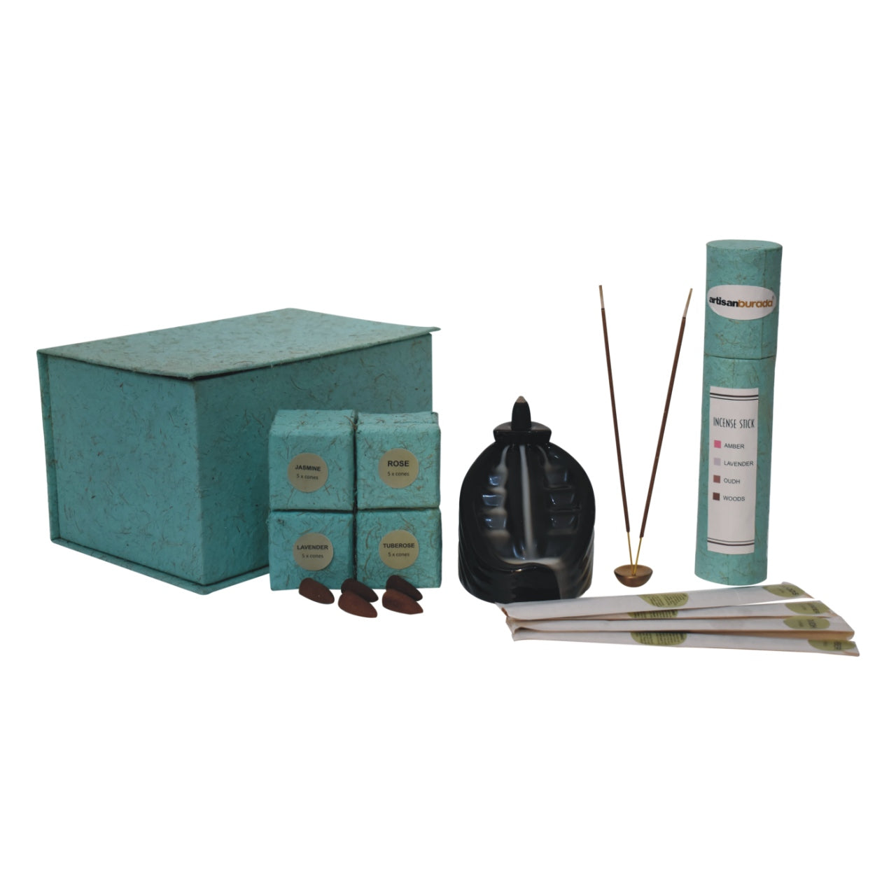 | The backflow fountain burner set is exquisitely crafted and features a unique level step design, ideal as a gift for friends and family. The set includes a backflow burner, incense holder, fragrant backflow cones in Rose, Lavender, Jasmine and Tuberose & fragrant incense sticks in Amber, Lavender, Oudh and Woods. The incense burner can clean a calm and peaceful environment with the smoke being created in the air to maintain a pleasant body and mind, and improve the efficiency of work and quality of life. |