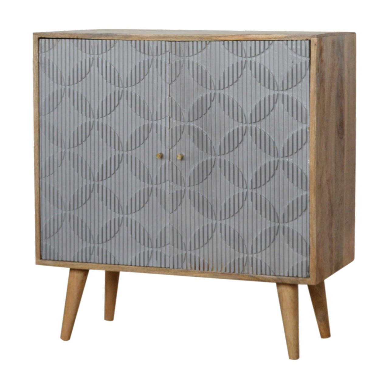 Add this lovely sideboard to your living room, or bedroom. It features a beautiful carved design on the door fronts and has been constructed from 100% solid mango wood in an oak-style finish with grey painted door fronts. It can be used in any part of the home and can be matched well with different styles and finishes of furniture.