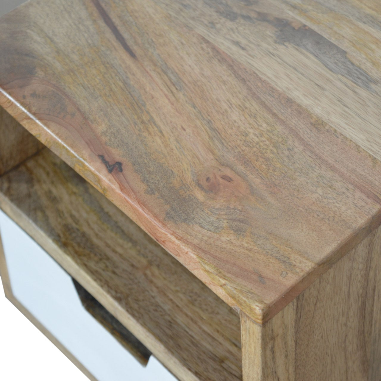 This beautifully designed bedside is constructed from 100% solid mango wood and has a fine oak-style finish. Useful storage space is available with a 1 white hand painted drawer, 1 shelf and a decent sized table top to place any ornaments. Other features include 4 Scandinavian styled legs to give the piece a modern style which will suit most interiors.