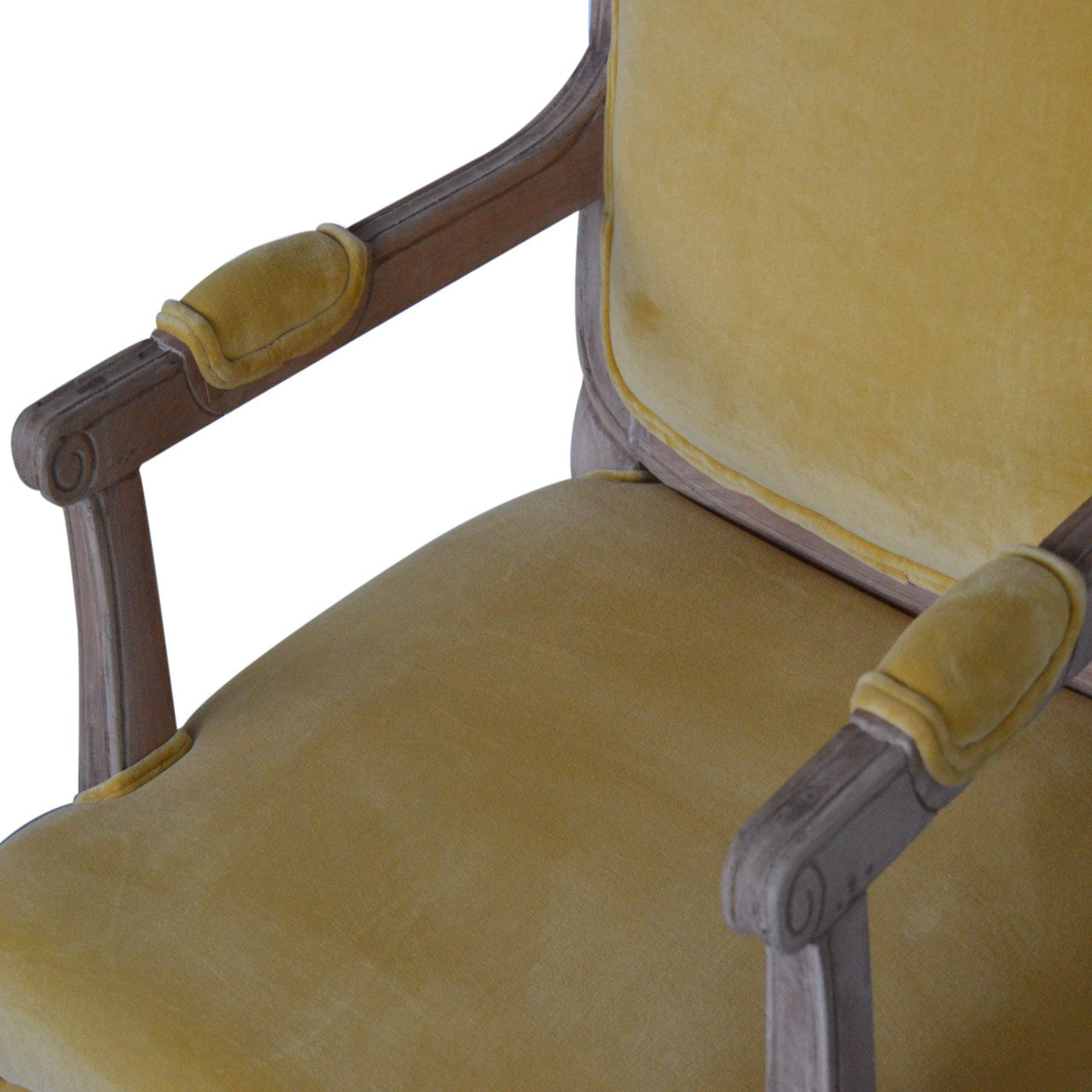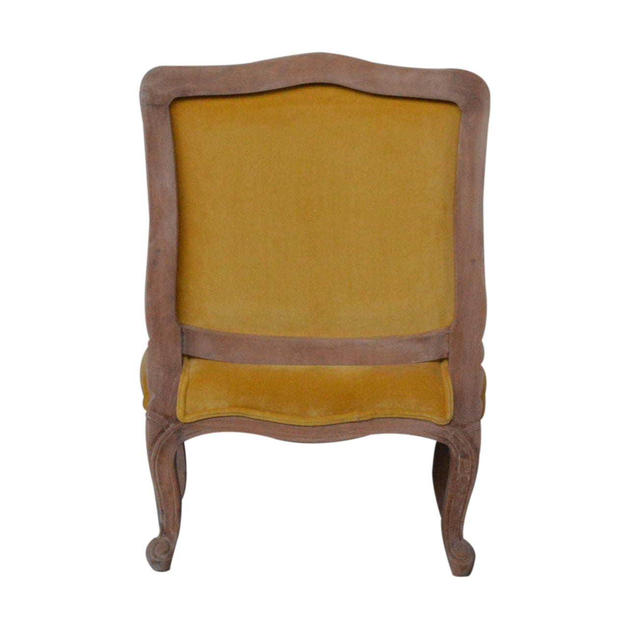 This elegant chair has been upholstered in a mustard yellow cotton velvet fabric. It features carved French style cabriole legs constructed from 100% solid mango wood in a sunbleach finish providing strength and durability. This simple yet classic piece can be incorporated in different home settings and interiors.