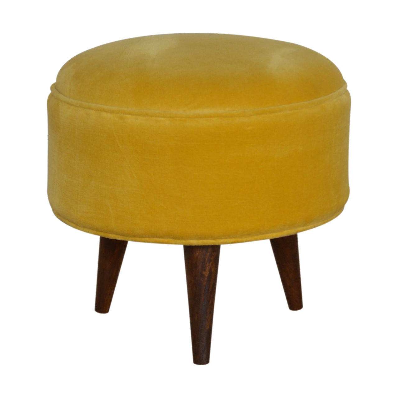 This beautiful footstool provides the perfect contrast between the beautiful upholstered mustard yellow cotton velvet and wooden legs constructed from 100% solid mango wood in walnut finish, made to compliment the classic Nordic style. Making a perfect footrest, handbag stand, or accent piece for the corner of the bedroom, hallway, or living space, this little stool will add a pop of colour to any room and serve handy all over the home.