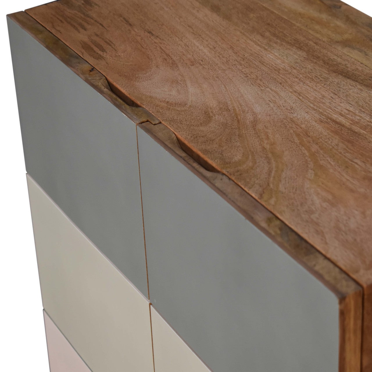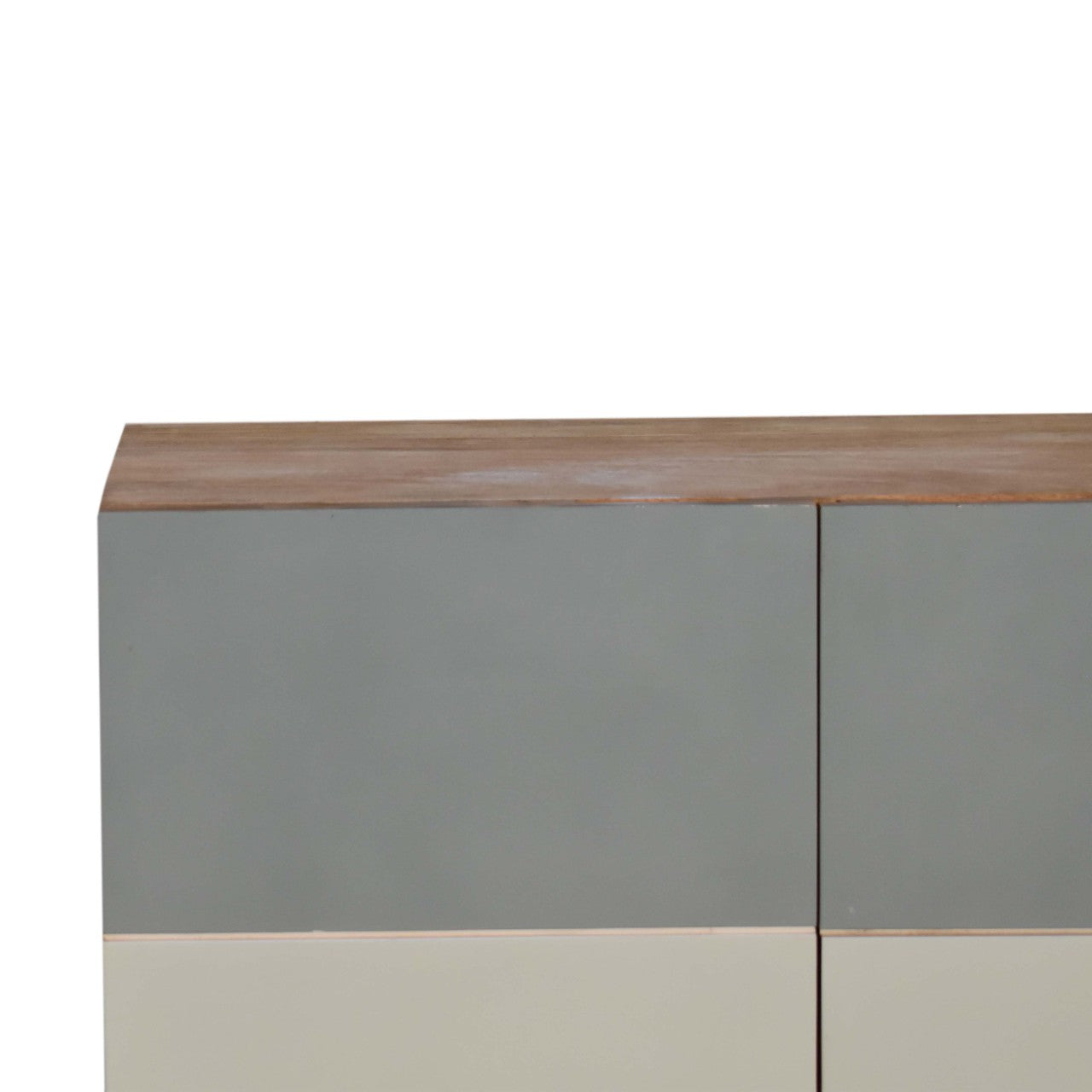 Offering a clean and sharp L pattern and hand painted in 3 rich shades of green this cabinet offers plenty of room on top for a candle, ornament or plant. Storage is offered with two doors which can be used to easily store bits and pieces with the space of 2 drawers. Other features include Nordic style legs and a body constructed from 100% solid mango wood.