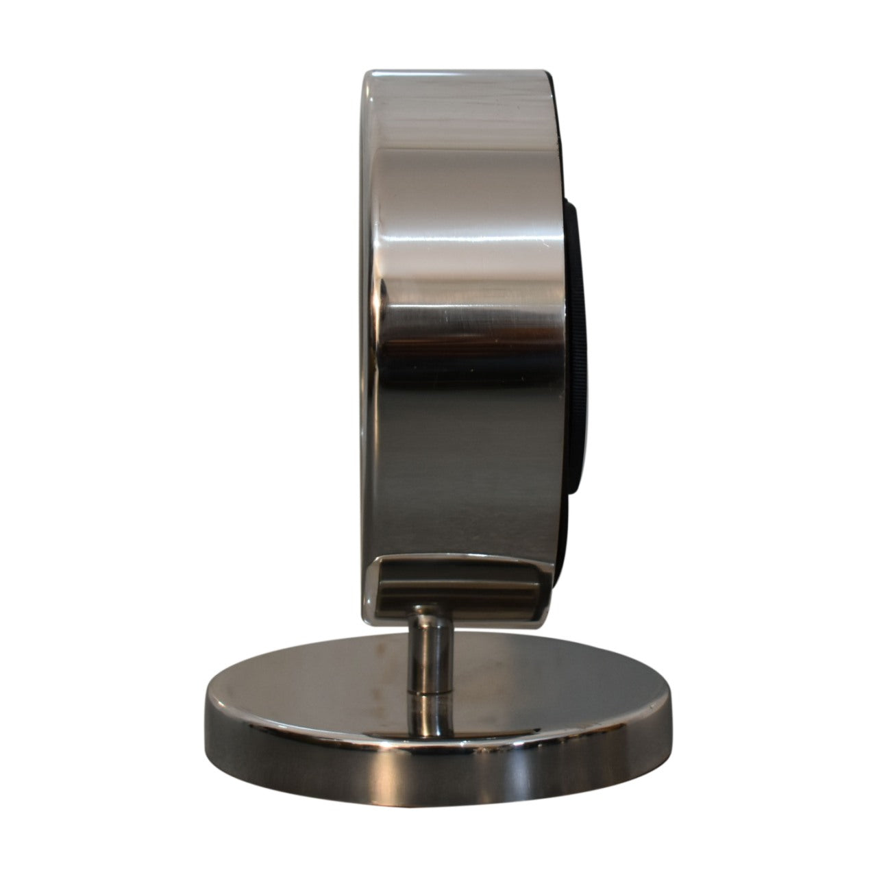 This round clock is a sleek addition to your bedside table. It offers a chrome frame and base with a simple face and overall minimalist look that will blend with many décor styles. This product is handcrafted individually and as every piece is unique please do expect slight variations in finish, texture and size, and should not be considered as a defect.