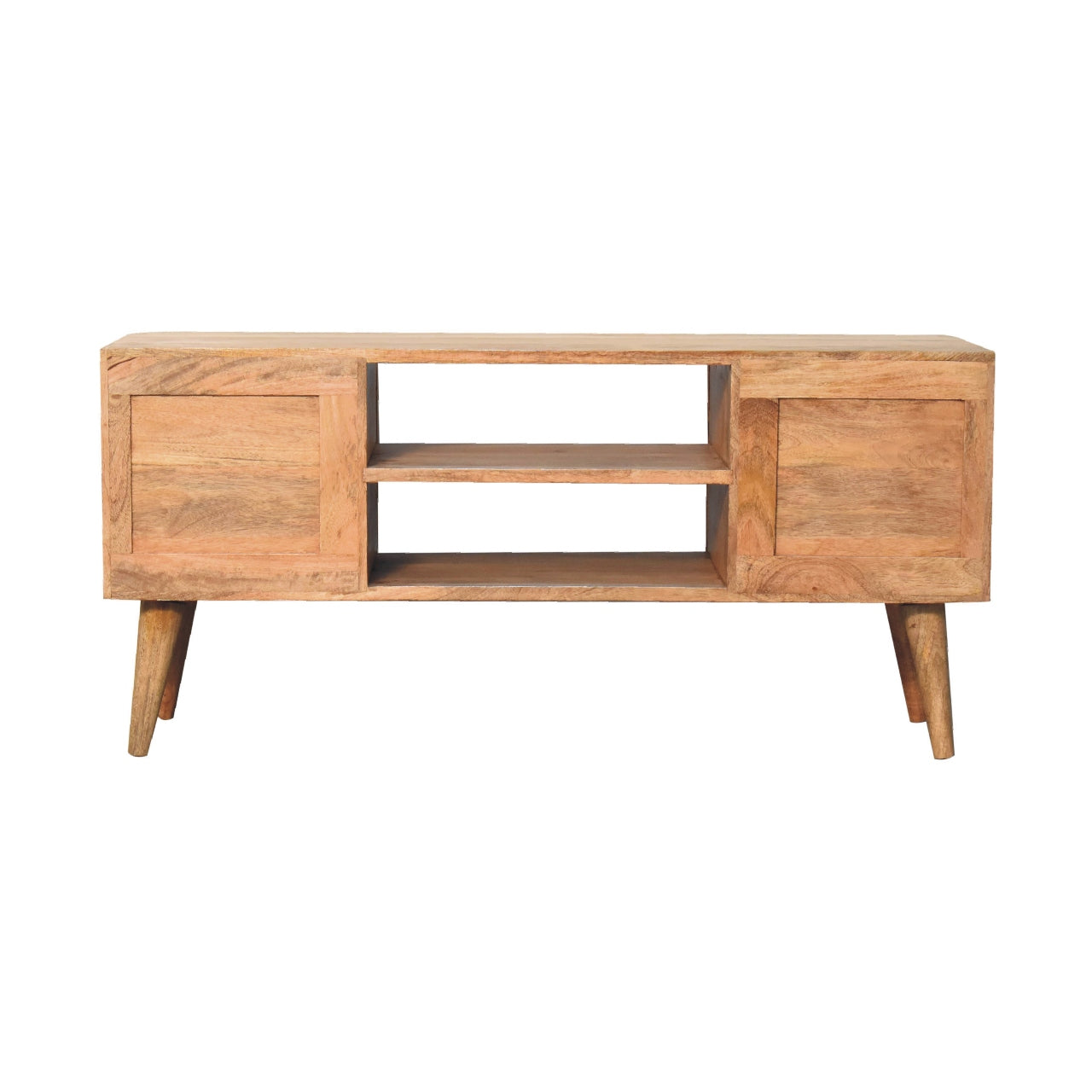 This beautiful Boho-inspired media unit has been constructed from 100% solid mango wood and has a fine oak-ish finish. Other features include 2 open slots and 2 bone inlay front cabinets as well as Nordic-style legs. The bone inlay is sourced responsibly .