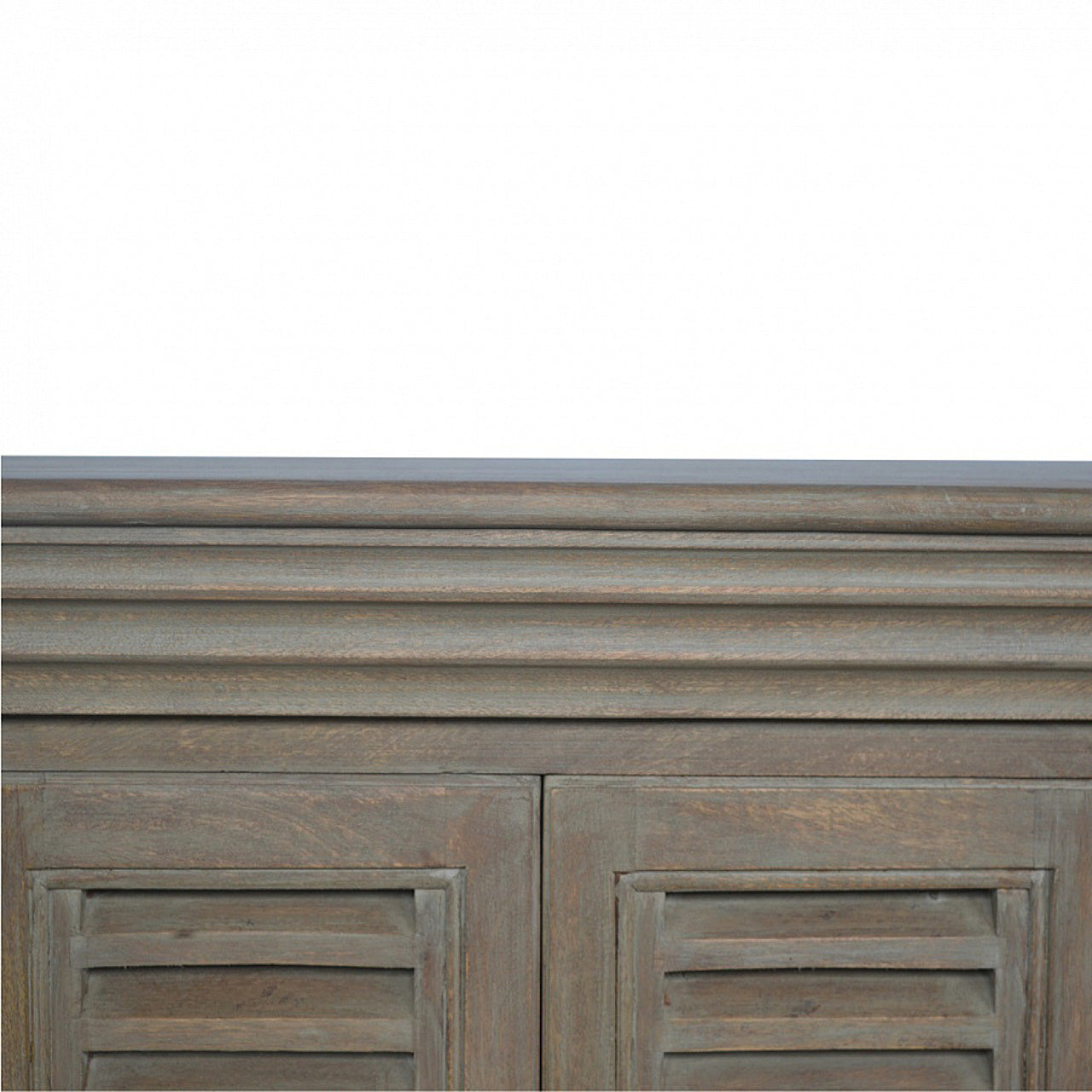 The TV Unit has been made from 100% Mango Wood and finished in a grey wash bleached finish is the epitome of coastal elegance. It comes with 6 French inspired shutters cabinet doors that have round knob handles. A few other features include a decent sized top to place your TV, also this media unit is floor mounted.