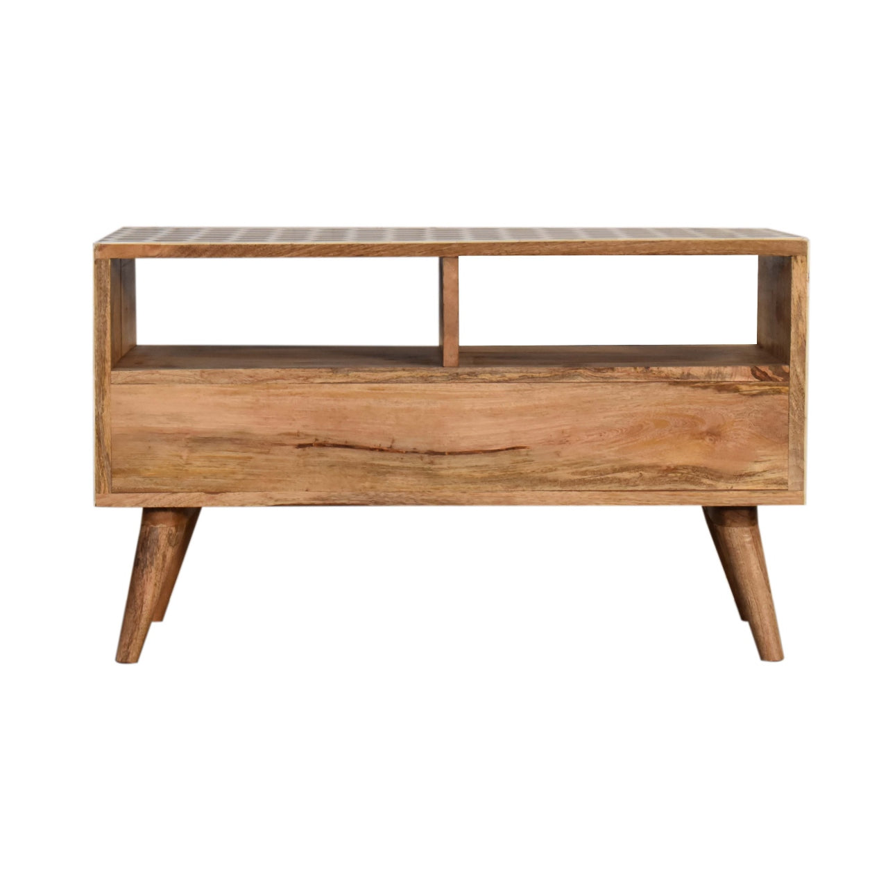 This media unit has a clean and simple design to suit most homes. This piece has a lovely oak-style finish and features 2 bone inlay drawer fronts which have a honeycomb pattern and 2 glass knobs. It provides 2 open slots and 2 drawers for extra storage. Some other features 4 Scandinavian style legs.