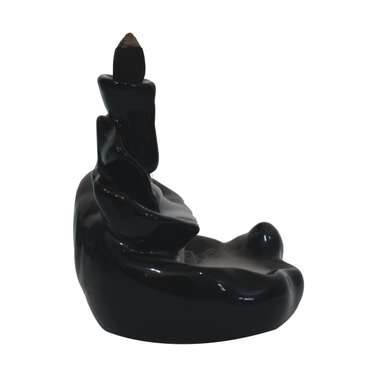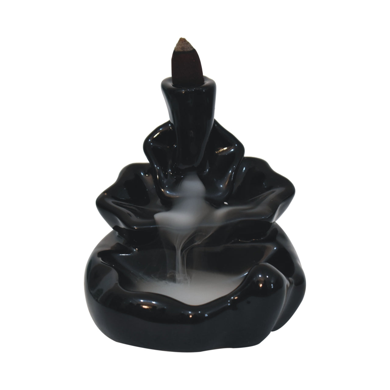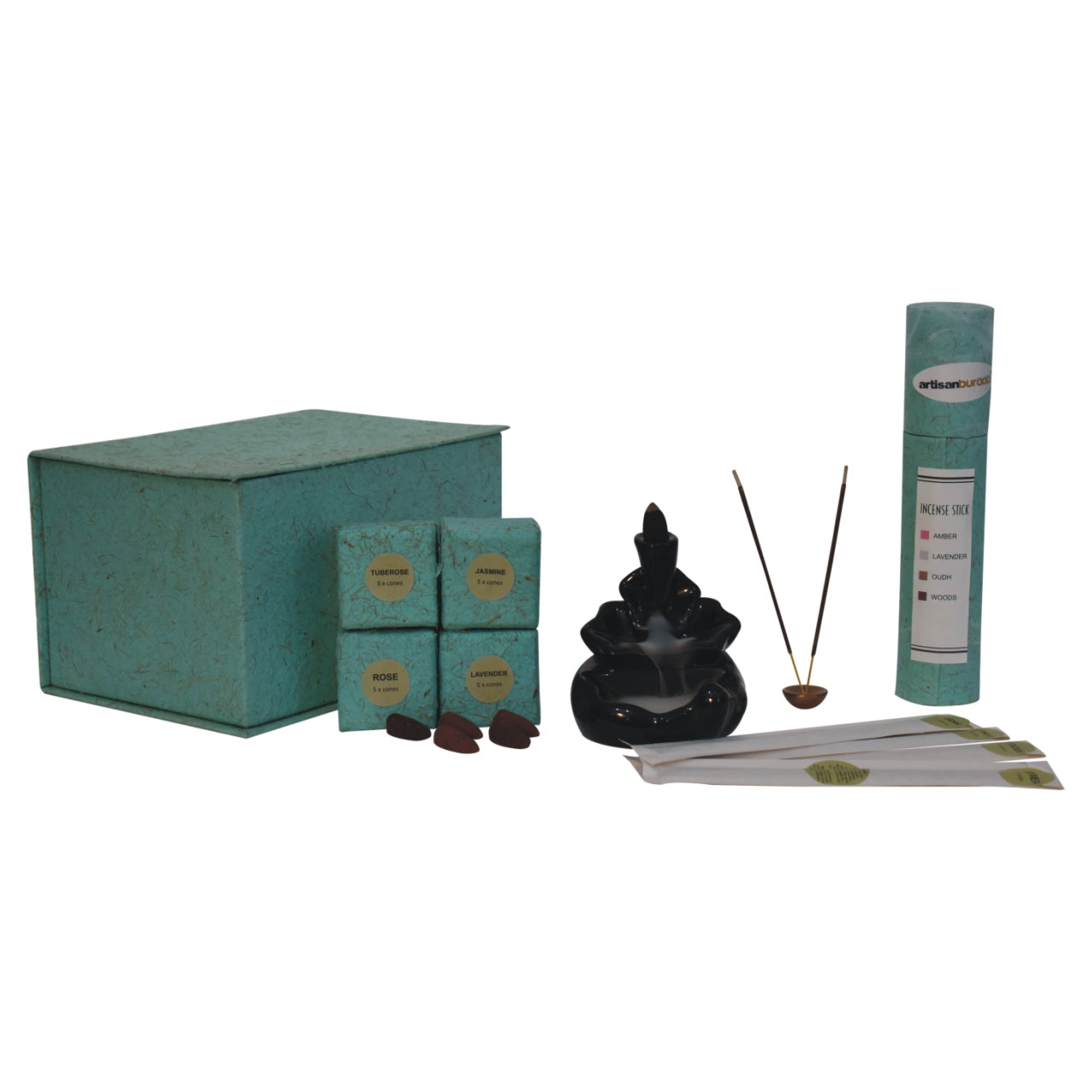 The backflow fountain burner set is exquisitely crafted and features a unique abstract design, ideal as a gift for friends and family. The set includes a backflow burner, incense holder, fragrant backflow cones in Rose, Lavender, Jasmine and Pineapple and fragrant inscense sticks in Amber, Lavender, Oudh and Woods.