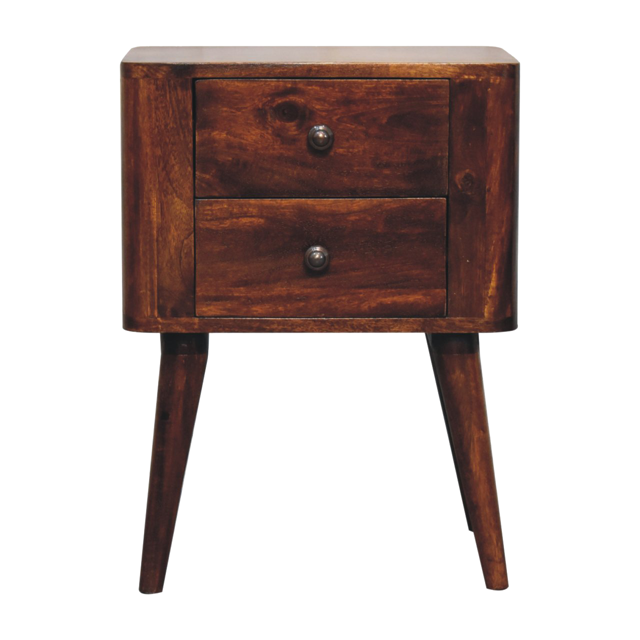 The Bera Bedside Table is ideal for adding a contemporary style to any bedroom. This bedside table is perfect for maximizing space while staying on trend with 2 drawers to keep things close before bedside. It is constructed from 100% solid mango wood in a chestnut finish and Nordic style legs, with shiny brass knobs on the drawers. Height: 60 cm, Width: 45 cm, Depth: 35 cm Carton Height: 45 cm, Carton Width: 55 cm, Carton Depth: 45 cm