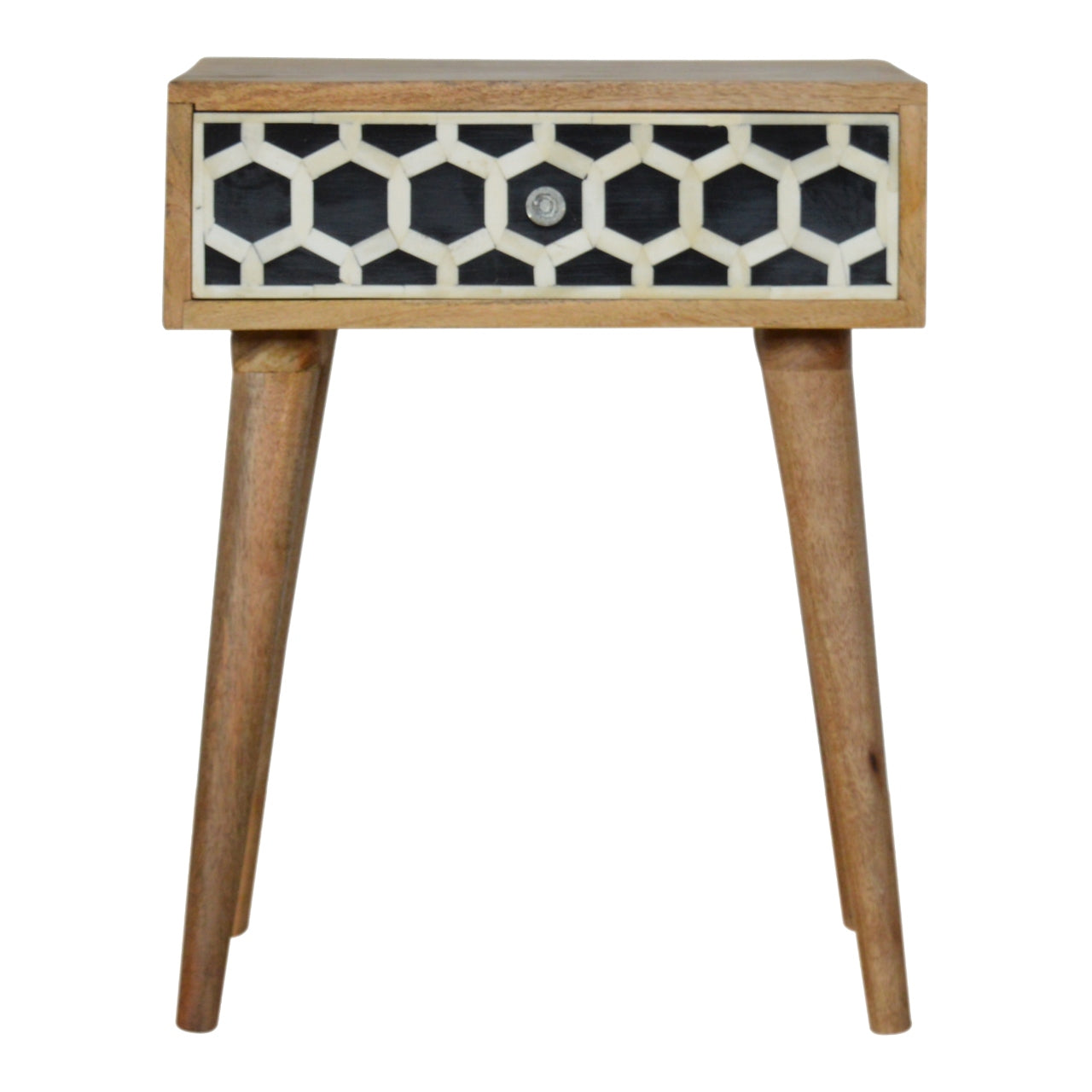 This versatile bedside table will prove handy all over your home. It has been constructed from 100% solid mango wood and has a fine oak-ish finish. It has 1 bone inlay drawer which has features a glass knob and 4 Scandinavian styled legs.