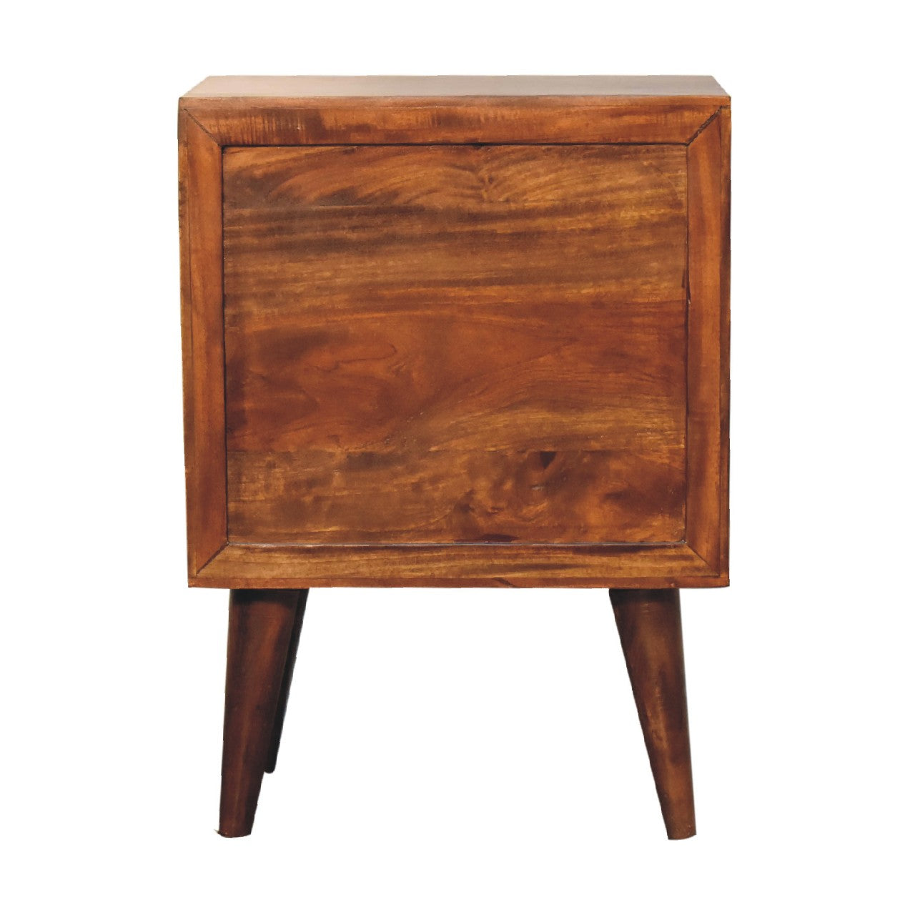 Introducing the "Botanic" Bedside Table, a charming addition to your bedroom. Crafted from 100% Melia/ Neem wood in a chestnut finish, this bedside table showcases natural beauty and warmth. The drawers feature delicate floral carvings, adding a touch of elegance and nature-inspired design. With a convenient knob, accessing your belongings is effortless. The table stands on sleek Nordic-style legs, bringing a modern touch to the classic design. Enjoy the perfect blend of simplicity and sophistication with this functional and stylish choice for your bedroom.