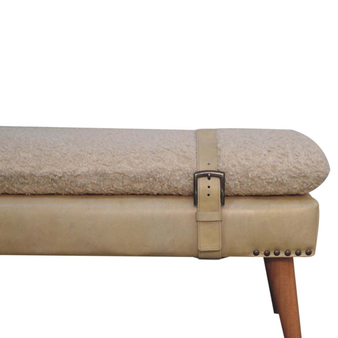 The Boucle x Beige Leather Bench showcases a harmonious blend of texture and elegance. Upholstered in 100% cotton boucle fabric and accented with genuine Buffalo hide leather, this piece exudes sophistication and warmth. The belted strap design adds a touch of character, while the nordic solid wood legs, finished in a classic oak-ish tone, provide durability and support. Perfect for entryways, bedrooms, or living spaces, it combines timeless craftsmanship with modern aesthetics to elevate your home décor.
